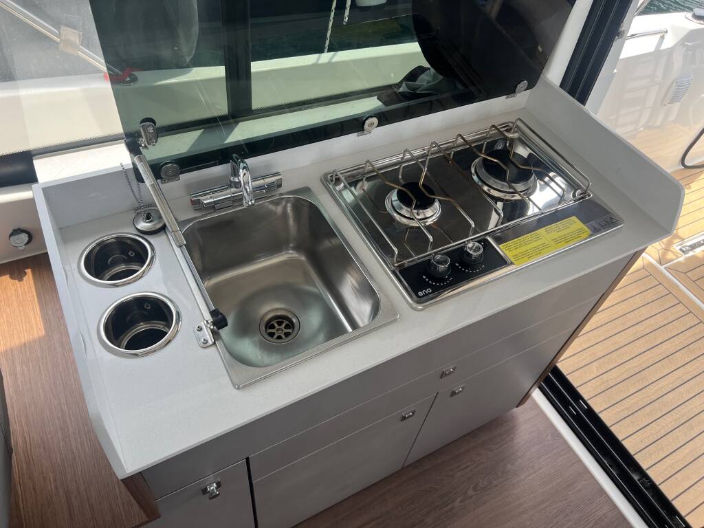Motorboot Antares 9 OB Jack, Baujahr 2024, liegt im Marina Punat, Krk, Kvarner, Kroatien vor Anker. Es verfügt über 2 Kabinen und bietet Platz für 4 + 2 Personen mit 1 Toiletten.