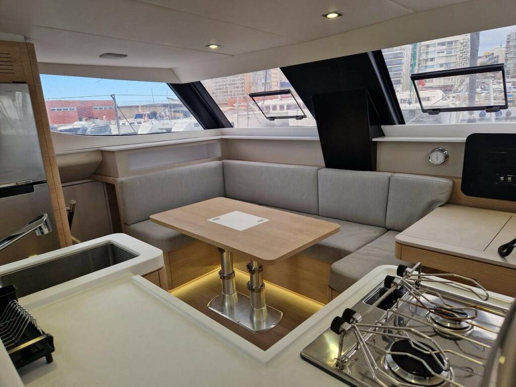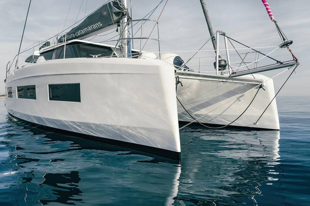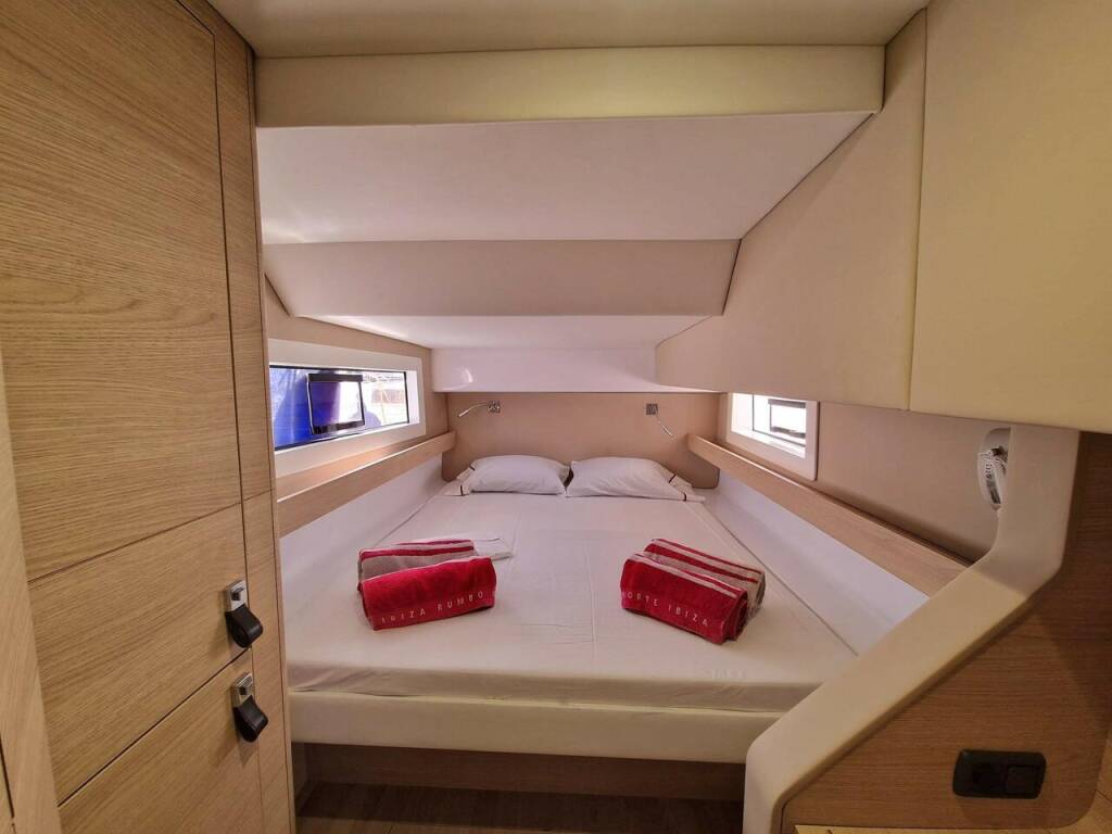 Katamaran Aventura 37 Hakuna, Baujahr 2024, liegt im Ibiza, Club Nàutic Sant Antoni de Portmany, Balearische Inseln, Spanien vor Anker. Es verfügt über 4 Kabinen und bietet Platz für 8 + 2 Personen mit 2 Toiletten.