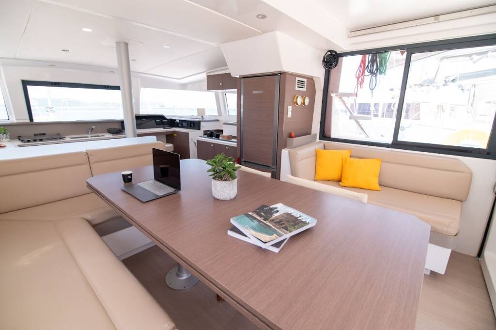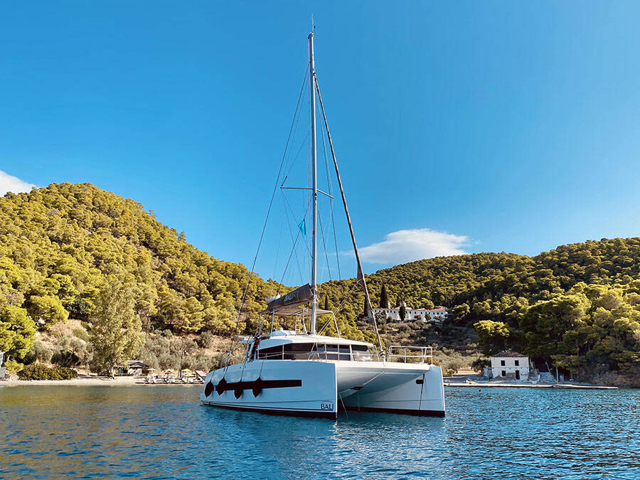 Katamaran Bali 4.1 Sinope, Baujahr 2020, liegt im Preveza Main Port, Ionisches Meer, Griechenland vor Anker. Es verfügt über 4 + 2 Kabinen und bietet Platz für 8 + 1 + 2 Personen mit 4 Toiletten.