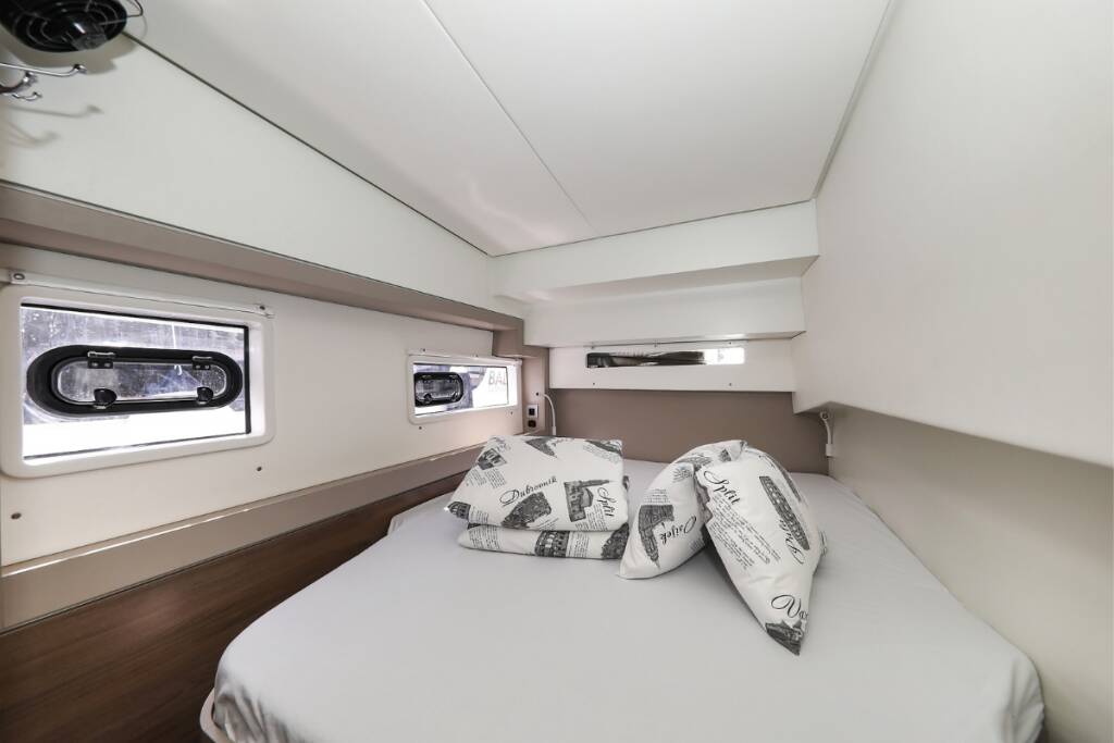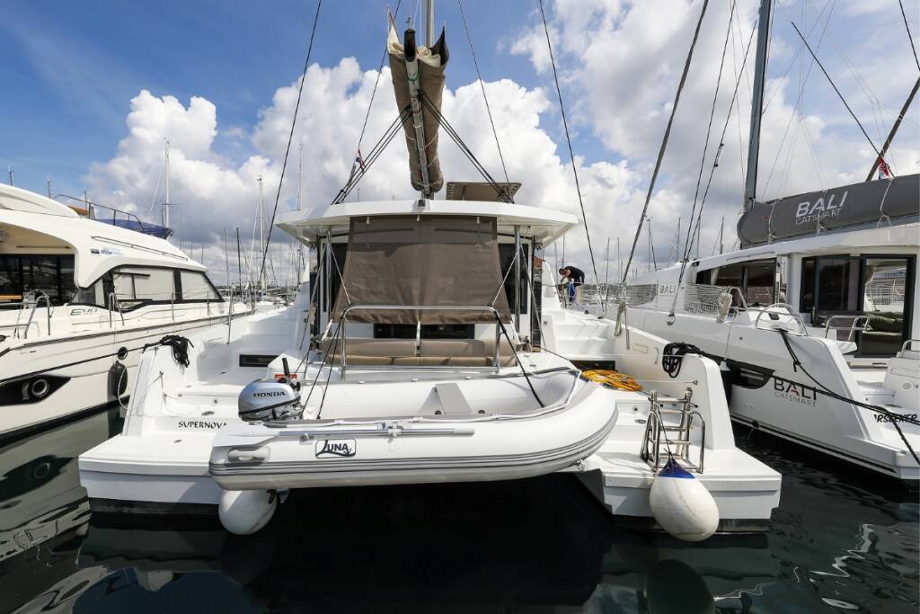 Katamaran Bali 4.2 Supernova, Baujahr 2023, liegt im Marina Kornati, Biograd, Zadar & Umgebung, Kroatien vor Anker. Es verfügt über 4 + 1 Kabinen und bietet Platz für 8 + 2 + 1 Personen mit 4 Toiletten.