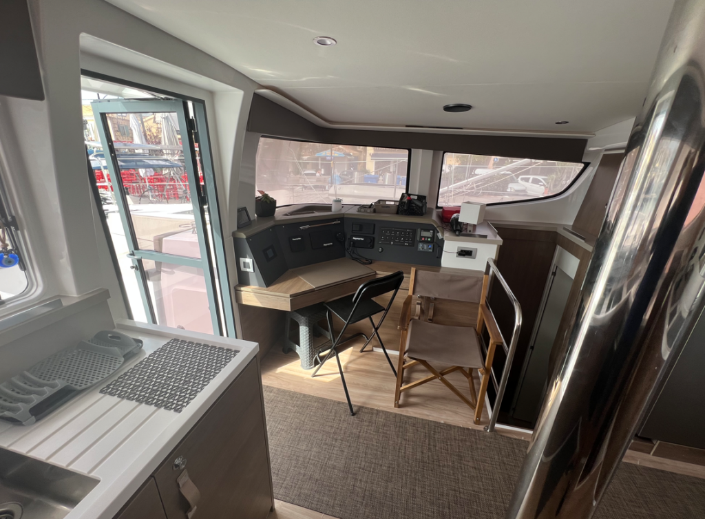 Katamaran Bali 4.4 Blue Diamond, Baujahr 2023, liegt im Lefkas main port, Ionisches Meer, Griechenland vor Anker. Es verfügt über 4 + 2 Kabinen und bietet Platz für 8 + 2 Personen mit 4 + 1 Toiletten.