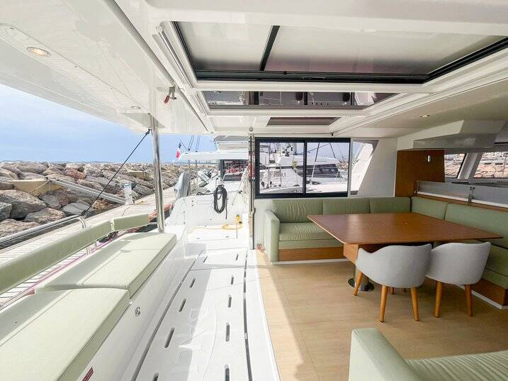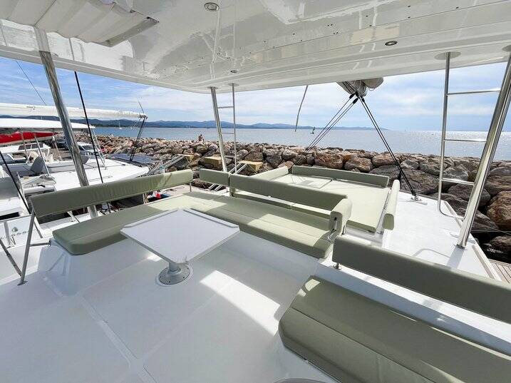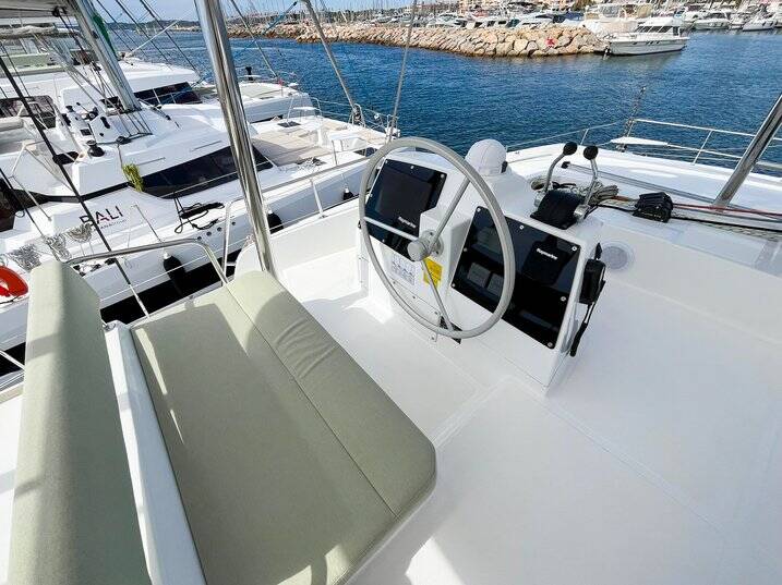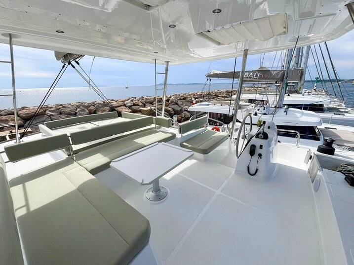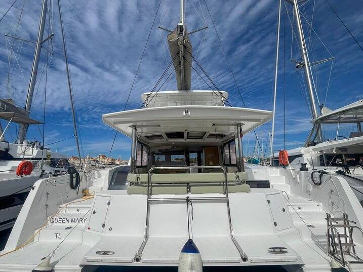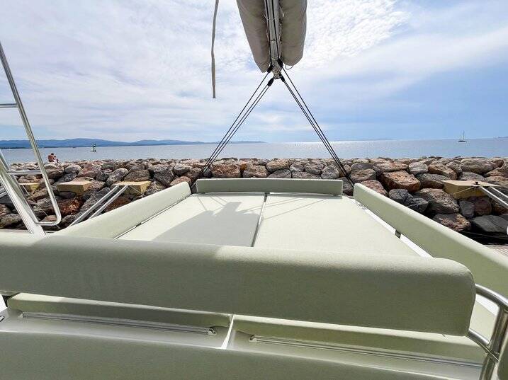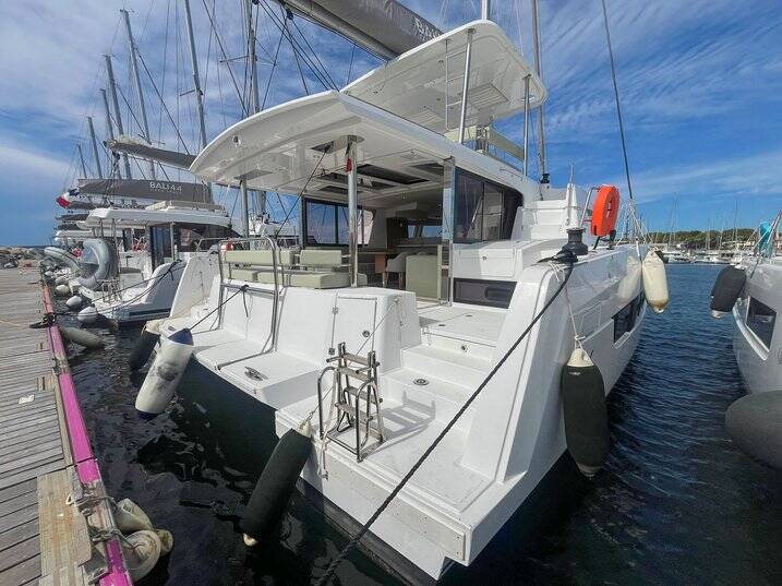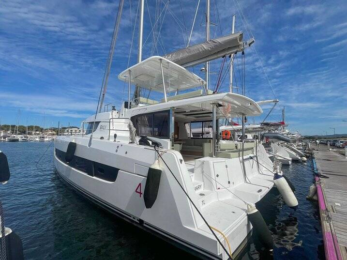 Katamaran Bali 4.6 Queen Mary, Baujahr 2025, liegt im Marines de Cogolin, Provence-Alpes-Côte d'Azur, Frankreich vor Anker. Es verfügt über 4 Kabinen und bietet Platz für 8 Personen mit 4 Toiletten.