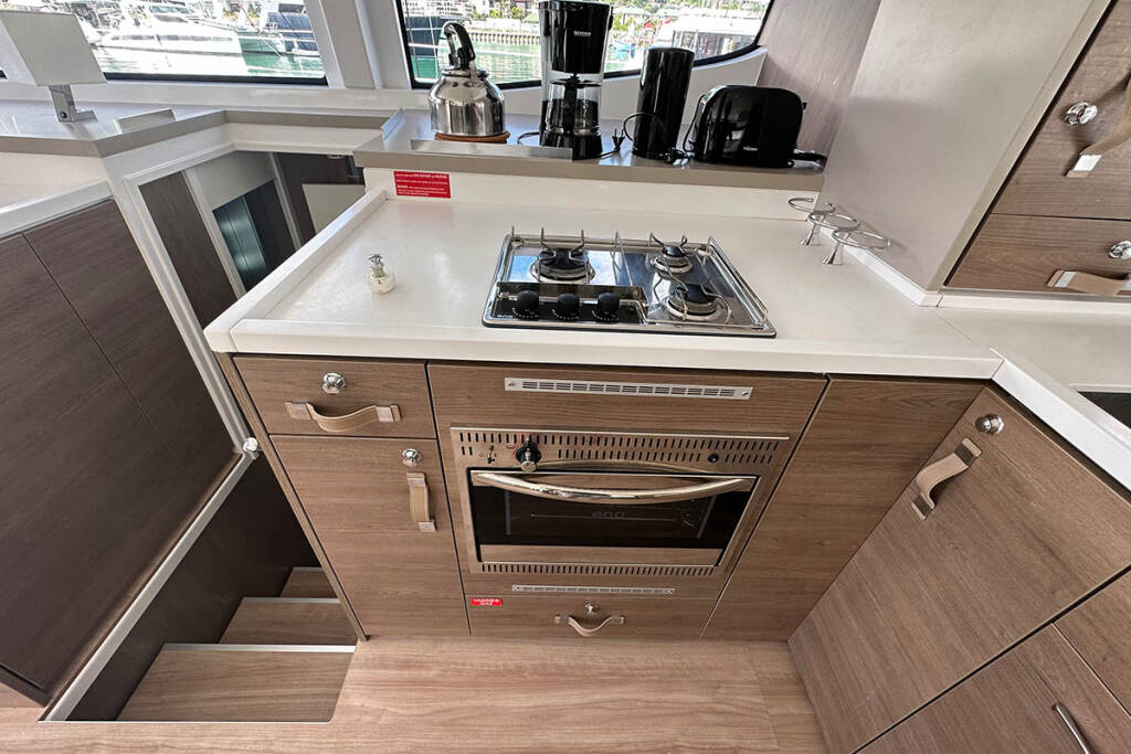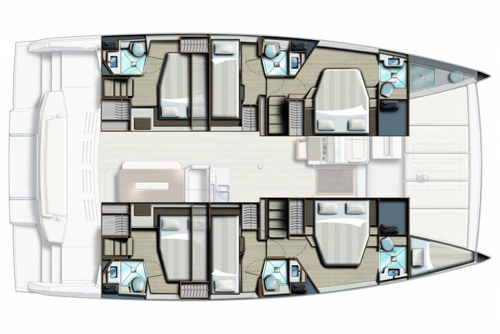 Katamaran Bali 4.8 Queen Feta, Baujahr 2023, liegt im Seychelles, Eden Island Marina, Mahé, Seychellen vor Anker. Es verfügt über 6 + 1 Kabinen und bietet Platz für 12 + 1 Personen mit 6 + 1 Toiletten.