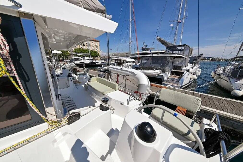 Katamaran Bali Catsmart Rose Sunset V, Baujahr 2024, liegt im Marina Zadar (ex. Tankerkomerc), Zadar & Umgebung, Kroatien vor Anker. Es verfügt über 4 + 2 Kabinen und bietet Platz für 8 + 2 + 2 Personen mit 2 Toiletten.