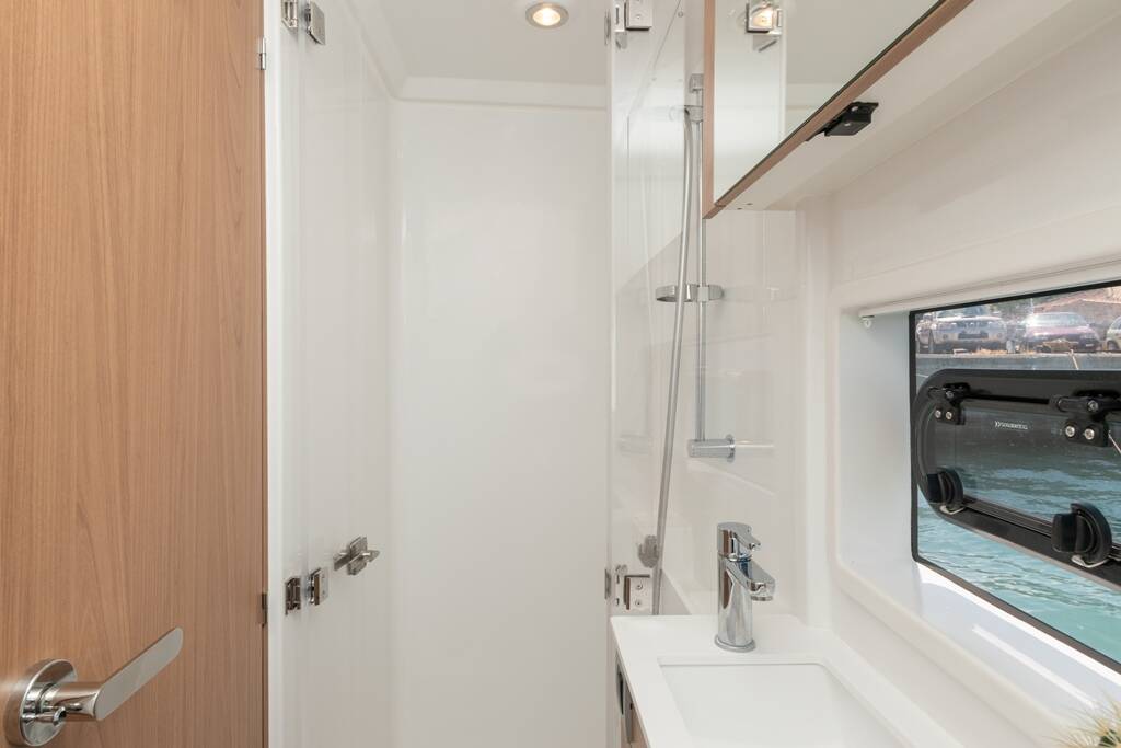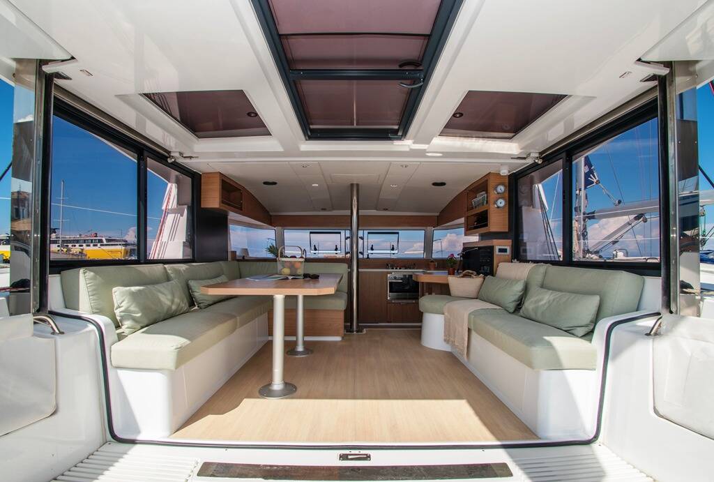 Katamaran Bali Catsmart Skiouros II, Baujahr 2024, liegt im Lefkada, Nydri, Armonia Hotel, Ionisches Meer, Griechenland vor Anker. Es verfügt über 4 Kabinen und bietet Platz für 8 Personen mit 2 Toiletten.