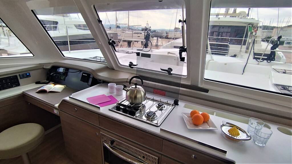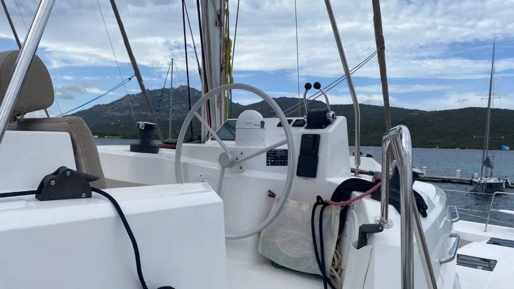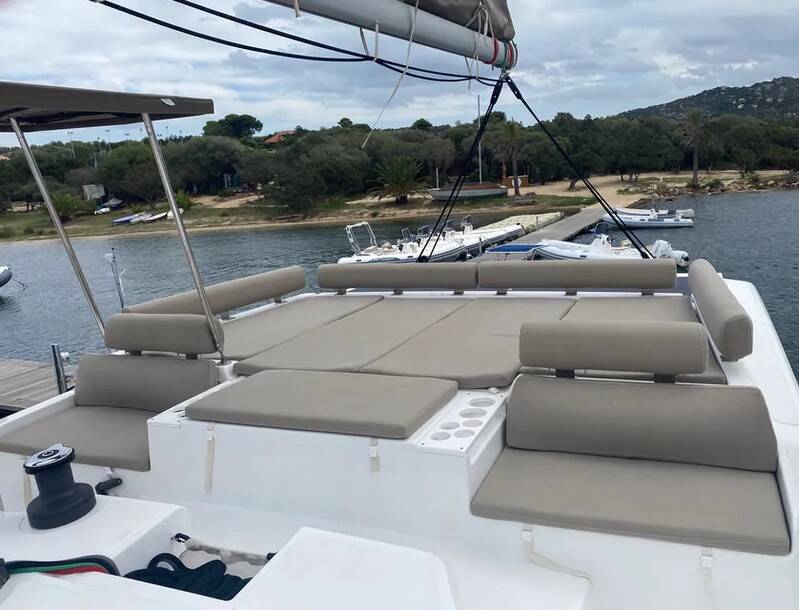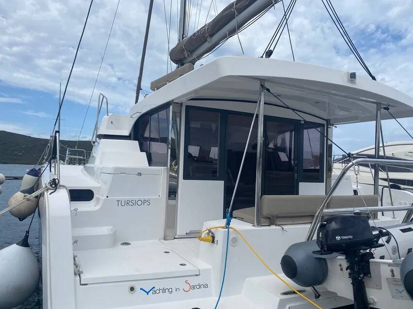 Katamaran Bali Catspace Tursiops, Baujahr 2022, liegt im Marina di Portisco, Sardinien, Italien vor Anker. Es verfügt über 4 Kabinen und bietet Platz für 8 Personen mit 4 Toiletten.