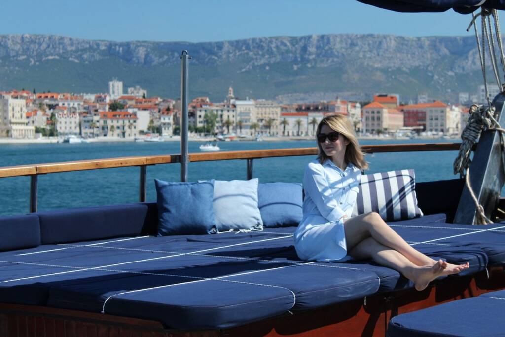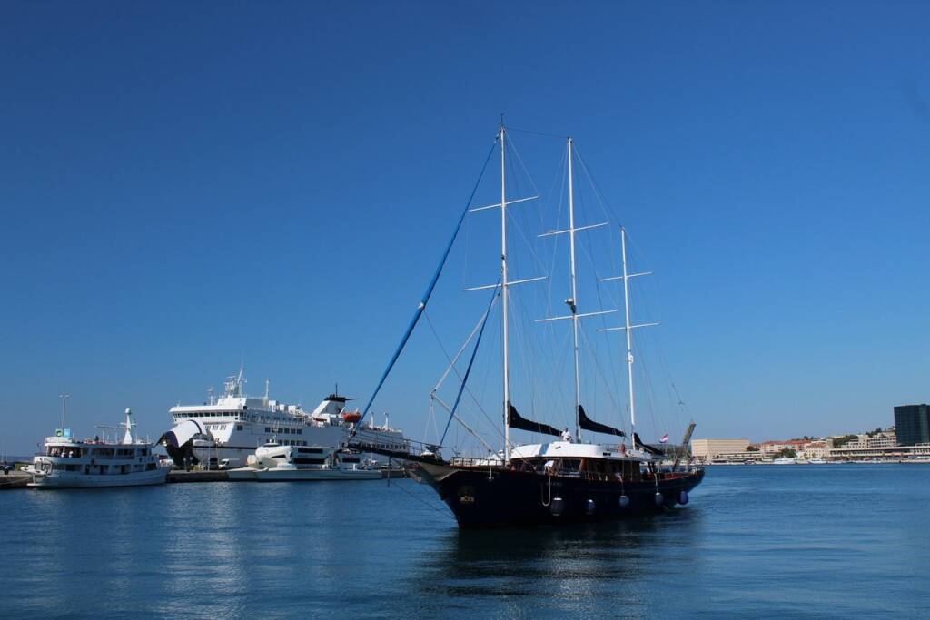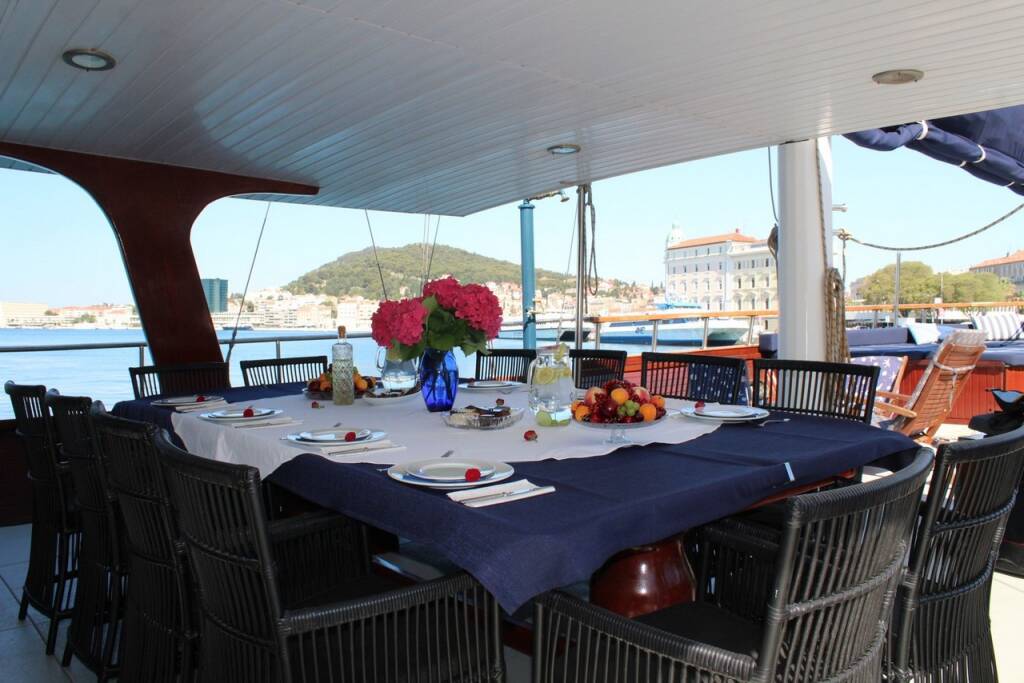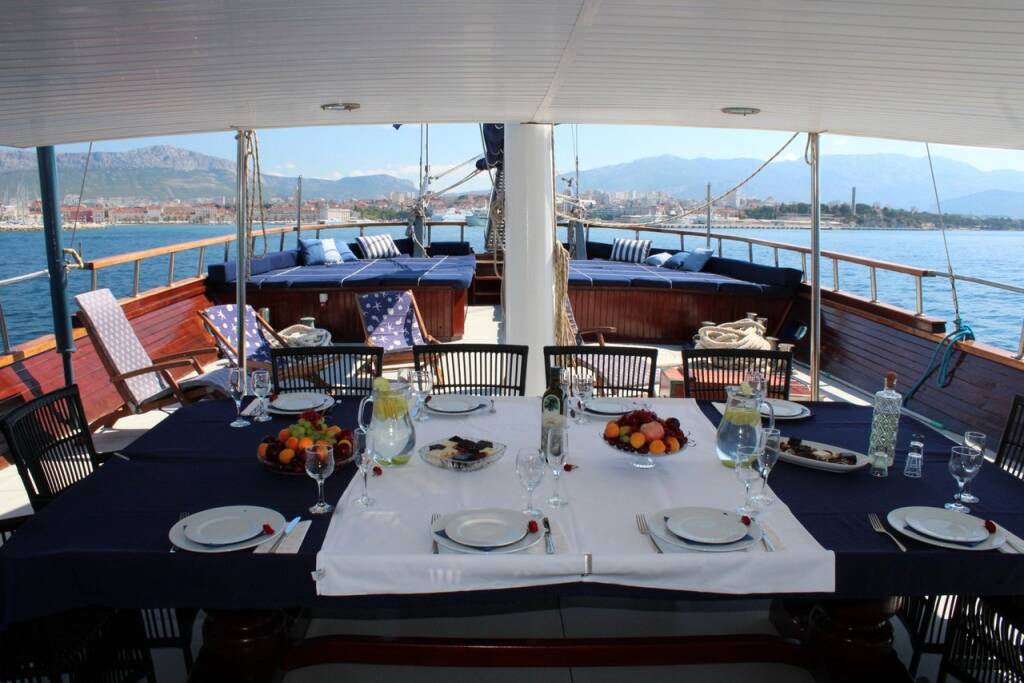 Gulet Barba Barba, Baujahr 1989, liegt im Marina Spinut, Split, Split & Umgebung, Kroatien vor Anker. Es verfügt über 6 Kabinen und bietet Platz für 12 Personen mit 6 Toiletten.