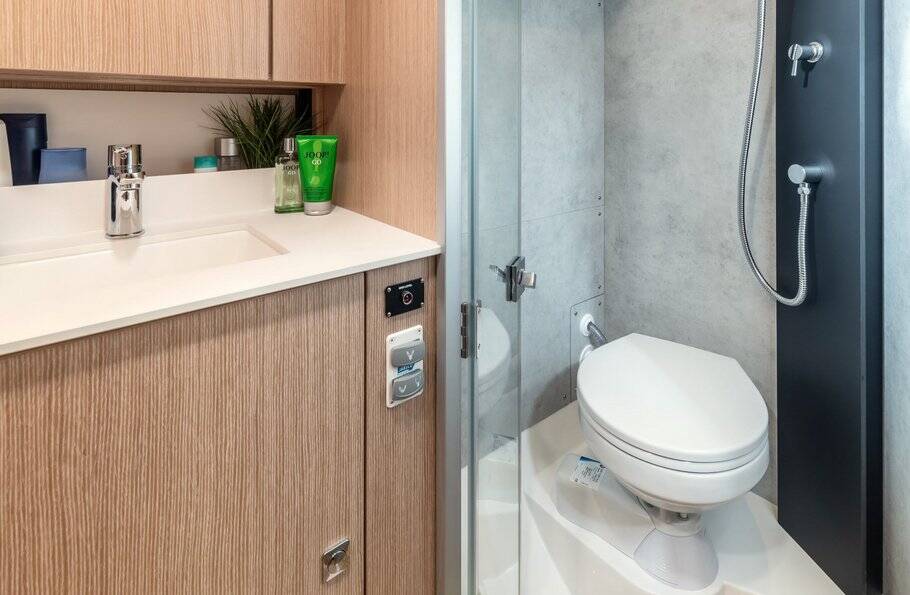 Segelyacht Bavaria C42 Bella, Baujahr 2023, liegt im Corfu, Gouvia Marina, Ionisches Meer, Griechenland vor Anker. Es verfügt über 3 Kabinen und bietet Platz für 6 + 2 Personen mit 2 Toiletten.