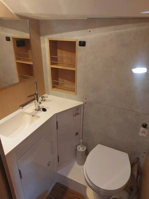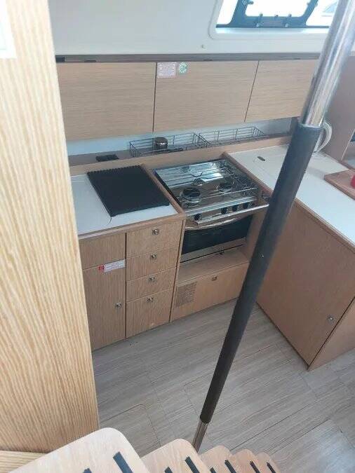 Segelyacht Bavaria C42 Marabou, Baujahr 2023, liegt im Lefkas, D-Marin, Ionisches Meer, Griechenland vor Anker. Es verfügt über 3 Kabinen und bietet Platz für 6 + 2 Personen mit 2 Toiletten.