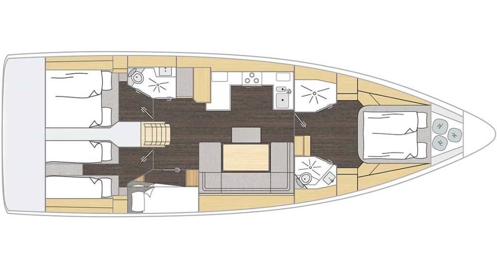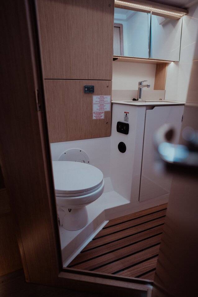 Segelyacht Bavaria C46 Art N, Baujahr 2025, liegt im Marina Pirovac, Sibenik & Umgebung, Kroatien vor Anker. Es verfügt über 4 Kabinen und bietet Platz für 8 + 2 Personen mit 2 Toiletten.