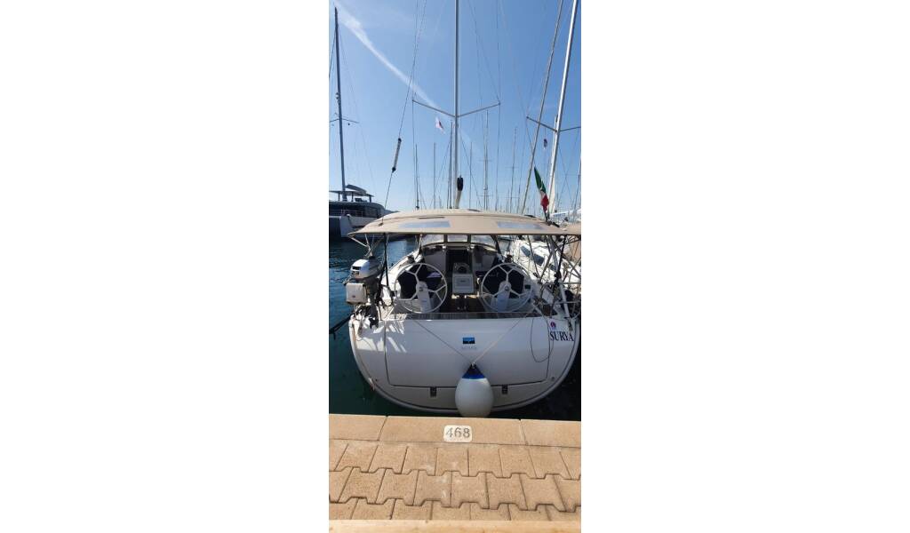 Segelyacht Bavaria Cruiser 41 Surya, Baujahr 2019, liegt im Portisco, Sardinien, Italien vor Anker. Es verfügt über 3 Kabinen und bietet Platz für 6 + 1 Personen mit 2 Toiletten.