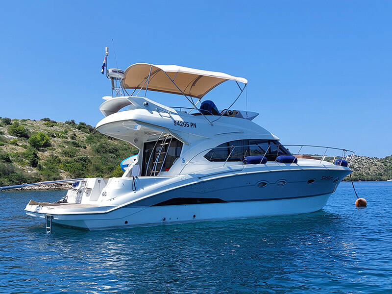 Motoryacht Beneteau Antares 42 Santin, Baujahr 2012, liegt im Marina Punat, Krk, Kvarner, Kroatien vor Anker. Es verfügt über 2 Kabinen und bietet Platz für 4 + 2 Personen mit 2 Toiletten.