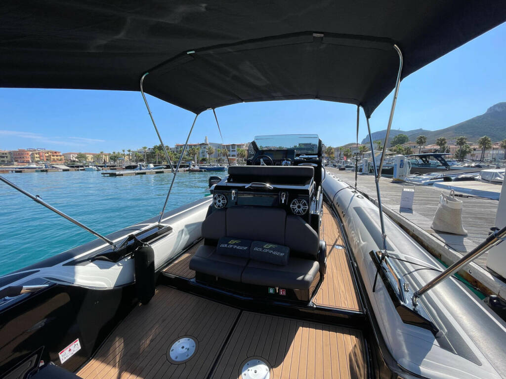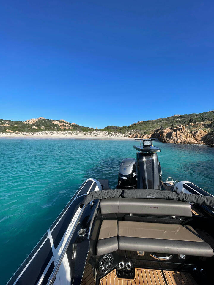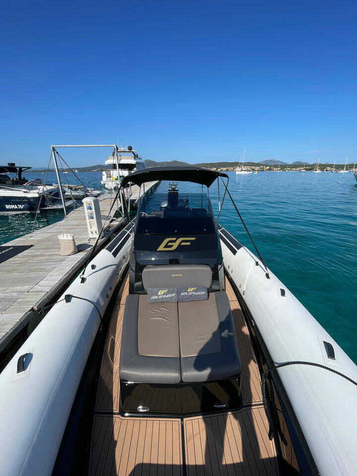 Schlauchboot Brig Eagle 10 Goldfinger, Baujahr 2022, liegt im Marina di Golfo Aranci, Sardinien, Italien vor Anker. Es verfügt über 1 Kabinen und bietet Platz für 1 Personen mit 1 Toiletten.
