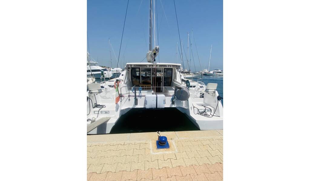 Katamaran C-Cat 37 Altair, Baujahr 2023, liegt im Portisco, Sardinien, Italien vor Anker. Es verfügt über 3 Kabinen und bietet Platz für 8 Personen mit 2 Toiletten.