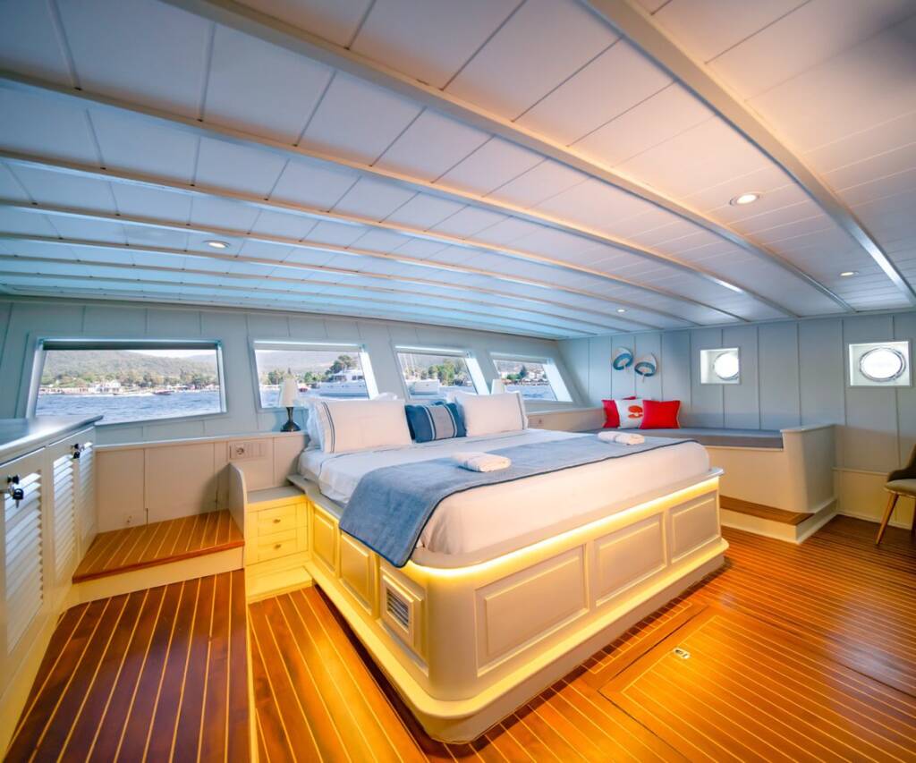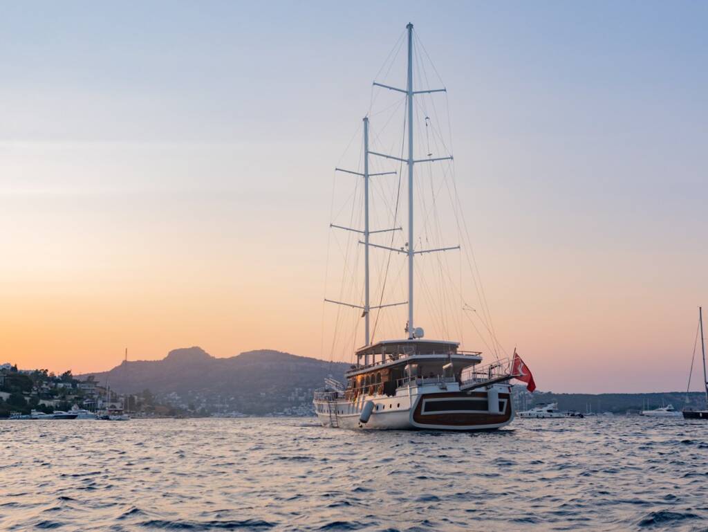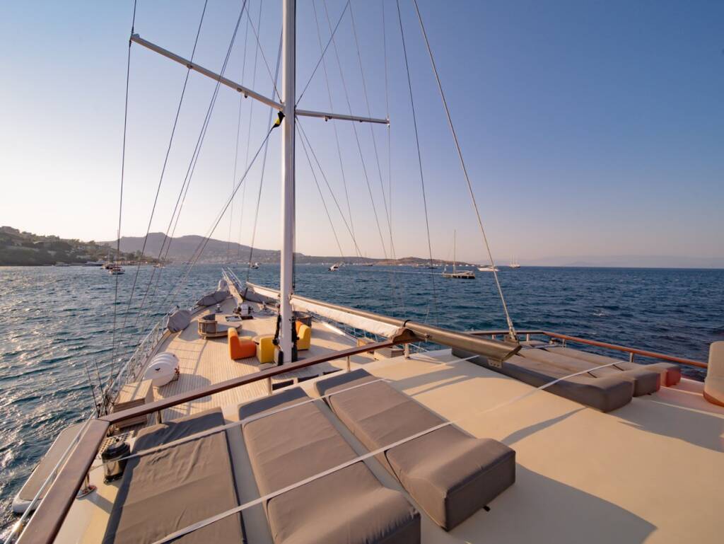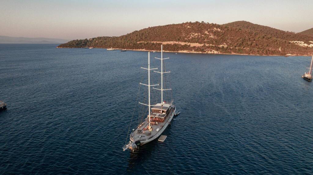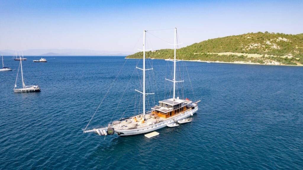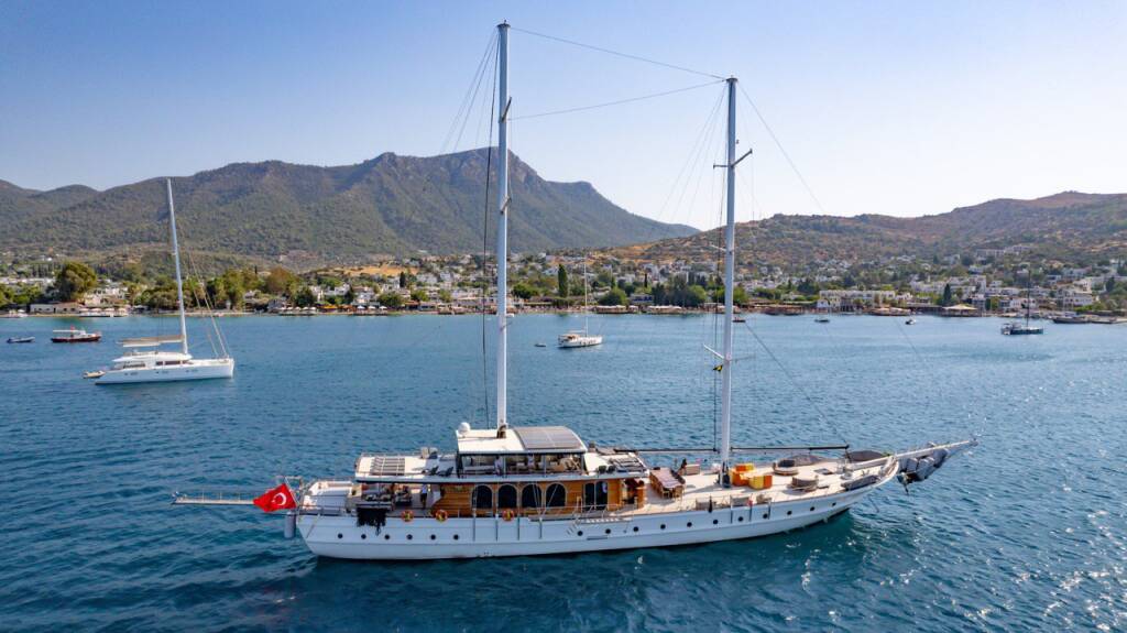 Gulet Caustic Caustic, Baujahr 2007, liegt im Bodrum Harbour, Aegean, Türkei vor Anker. Es verfügt über 6 + 3 Kabinen und bietet Platz für 12 + 6 Personen mit 6 Toiletten.