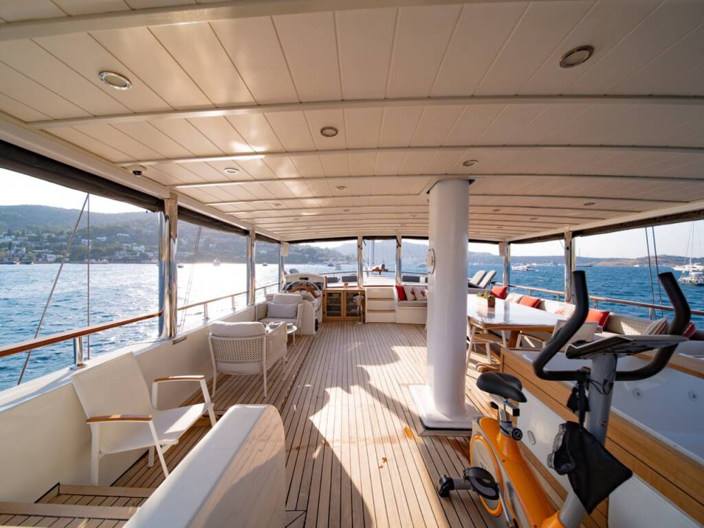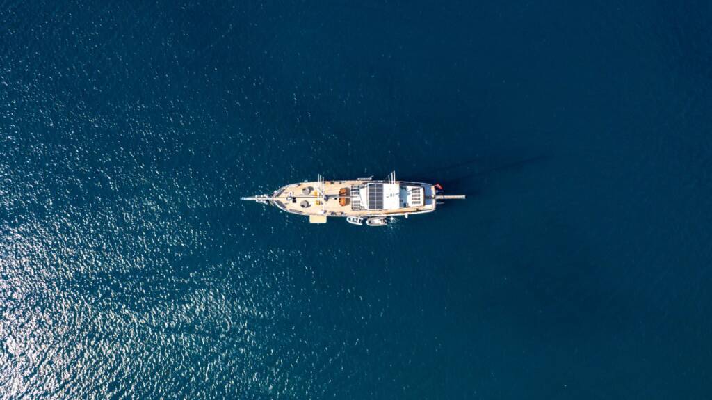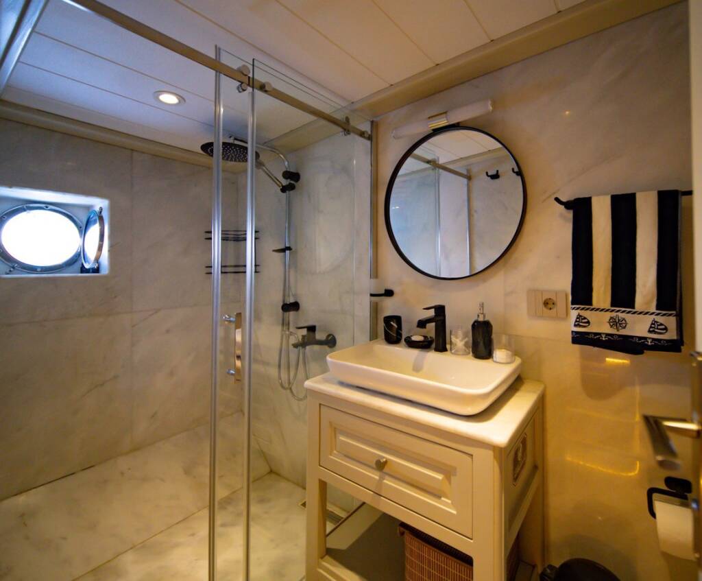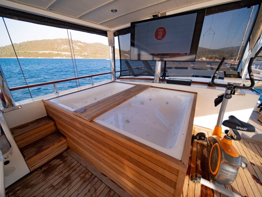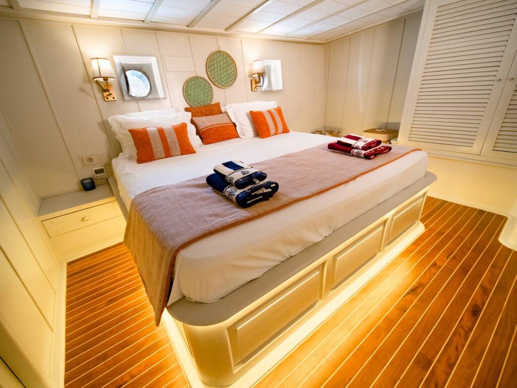 Gulet Caustic Caustic, Baujahr 2007, liegt im Bodrum Harbour, Aegean, Türkei vor Anker. Es verfügt über 6 + 3 Kabinen und bietet Platz für 12 + 6 Personen mit 6 Toiletten.