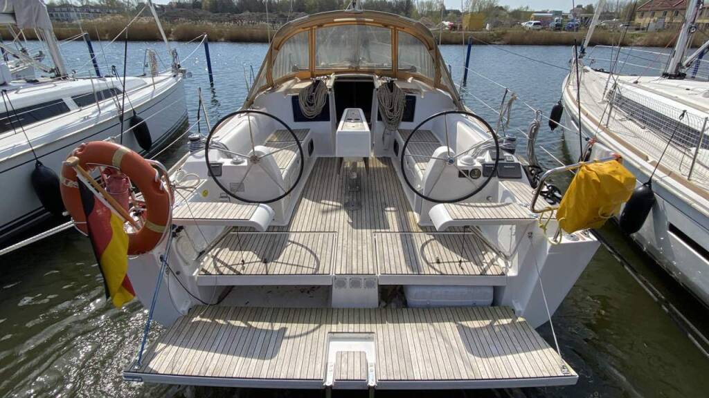 Segelyacht Dufour 382 GL Freedom, Baujahr 2017, liegt im Barth, Yachtwerft Ramin, Mecklenburg, Deutschland vor Anker. Es verfügt über 3 Kabinen und bietet Platz für 6 + 1 Personen mit 2 Toiletten.