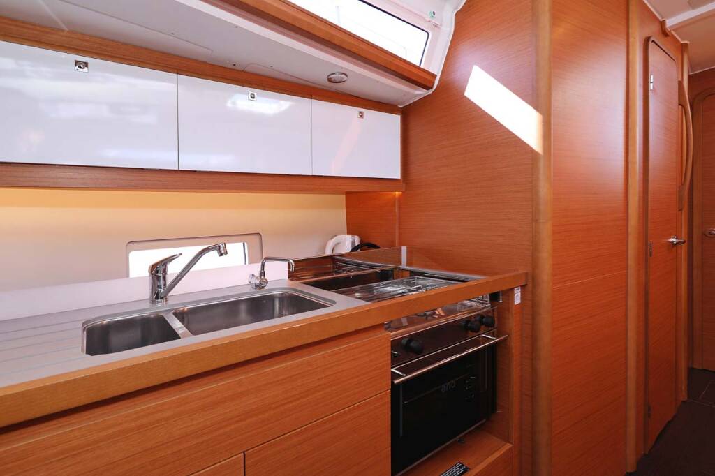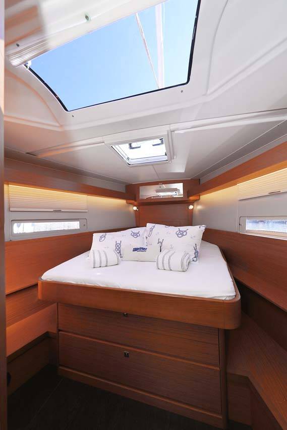 Segelyacht Dufour 430 Marista, Baujahr 2022, liegt im Murter, ACI Marina Jezera, Sibenik & Umgebung, Kroatien vor Anker. Es verfügt über 4 Kabinen und bietet Platz für 8 + 2 Personen mit 2 Toiletten.