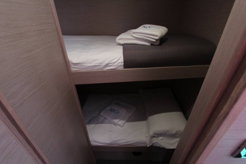 Katamaran Dufour 48 Catamaran Lublu, Baujahr 2022, liegt im Olbia, Marina di Cugnana, Sardinien, Italien vor Anker. Es verfügt über 5 + 1 Kabinen und bietet Platz für 10 + 1 + 1 Personen mit 5 + 1 Toiletten.