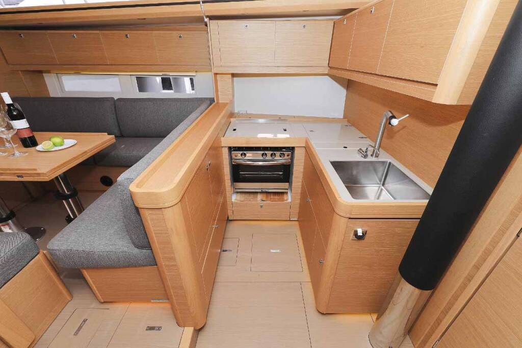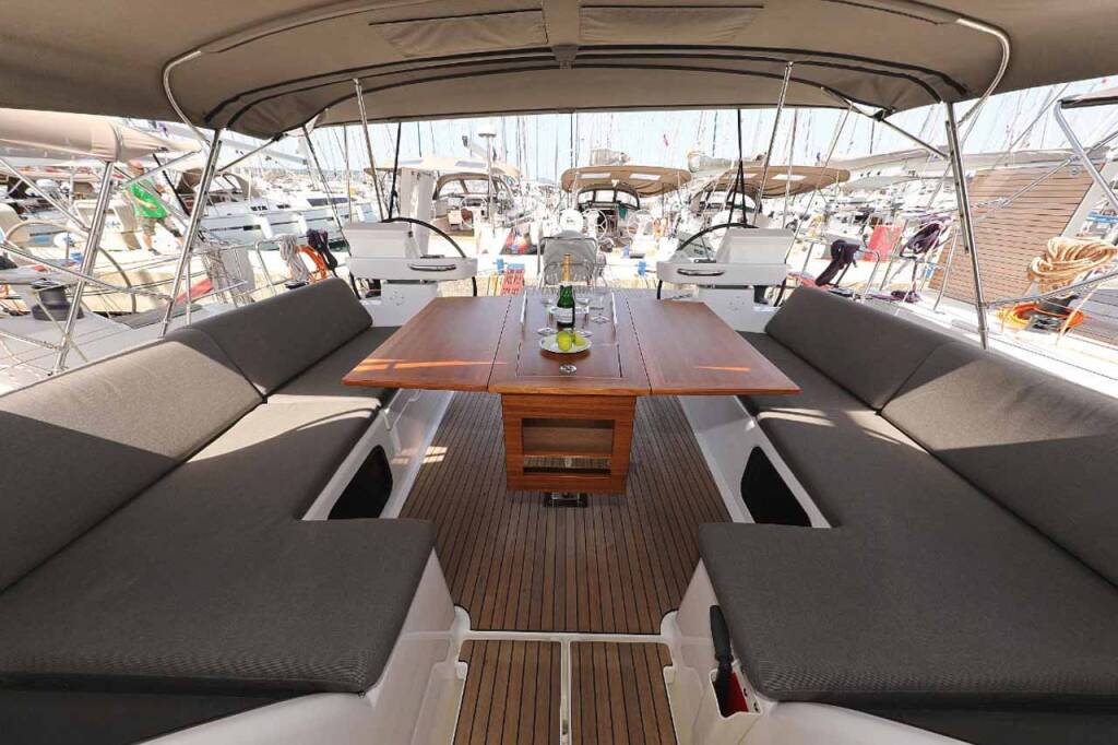 Segelyacht Dufour 520 GL Luna 77, Baujahr 2019, liegt im Marina Kornati, Biograd, Zadar & Umgebung, Kroatien vor Anker. Es verfügt über 5 Kabinen und bietet Platz für 10 + 2 Personen mit 3 Toiletten.