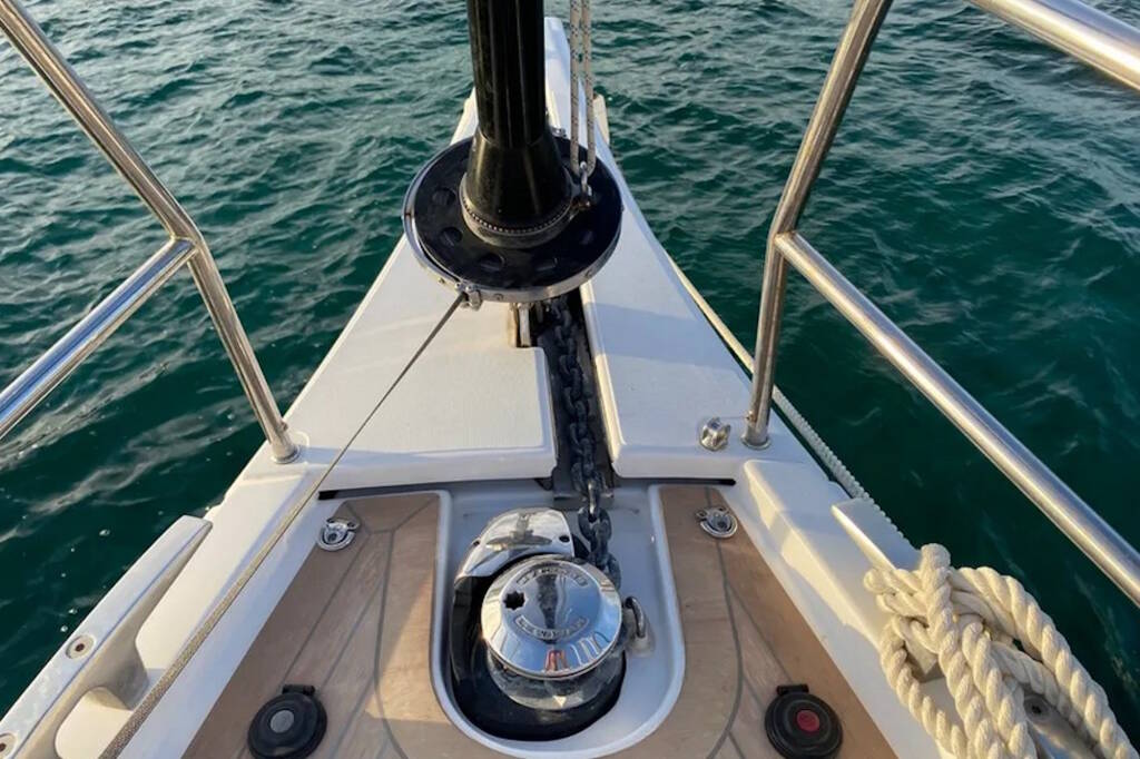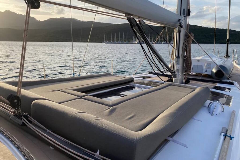Segelyacht Dufour 56 Exclusive Morisia, Baujahr 2022, liegt im Sardinia, Punta Nuraghe, Sardinien, Italien vor Anker. Es verfügt über 4 + 1 Kabinen und bietet Platz für 8 + 1 Personen mit 3 + 1 Toiletten.
