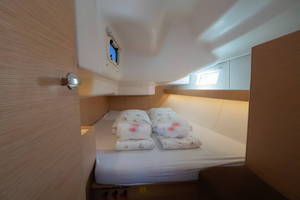 Segelyacht Elan Impression 40 Anadea, Baujahr 2017, liegt im Marina Kornati, Biograd, Zadar & Umgebung, Kroatien vor Anker. Es verfügt über 3 Kabinen und bietet Platz für 6 + 2 Personen mit 2 Toiletten.