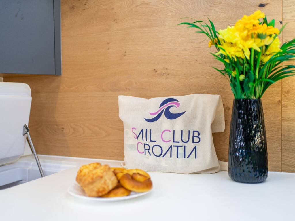 Segelyacht Elan Impression 45 Trinity, Baujahr 2023, liegt im Marina Kastela, Split & Umgebung, Kroatien vor Anker. Es verfügt über 4 Kabinen und bietet Platz für 8 + 2 Personen mit 2 Toiletten.