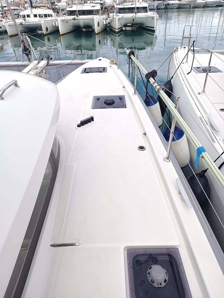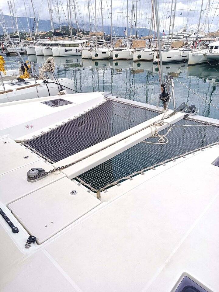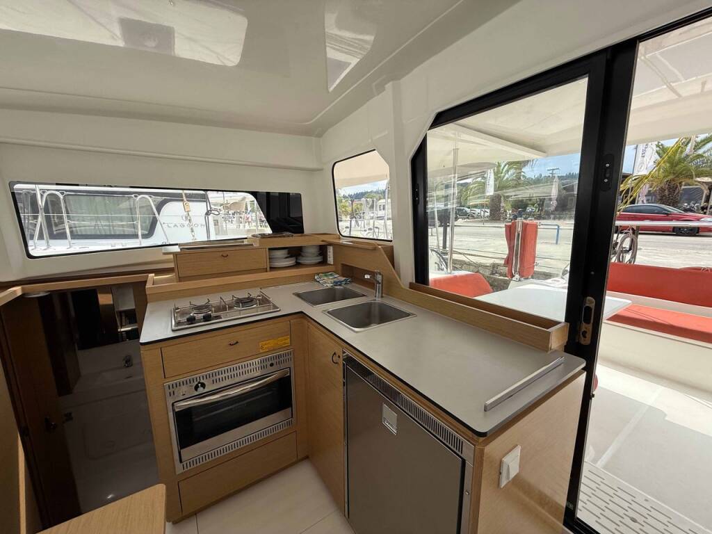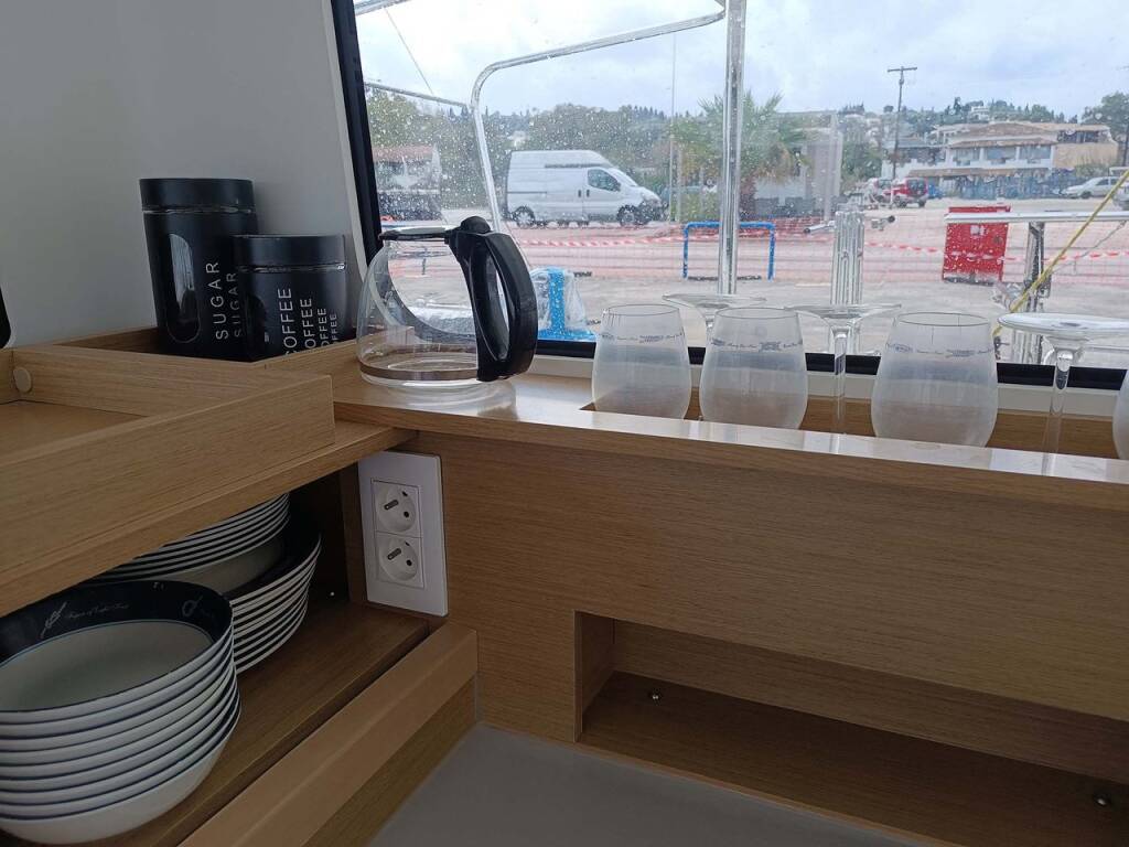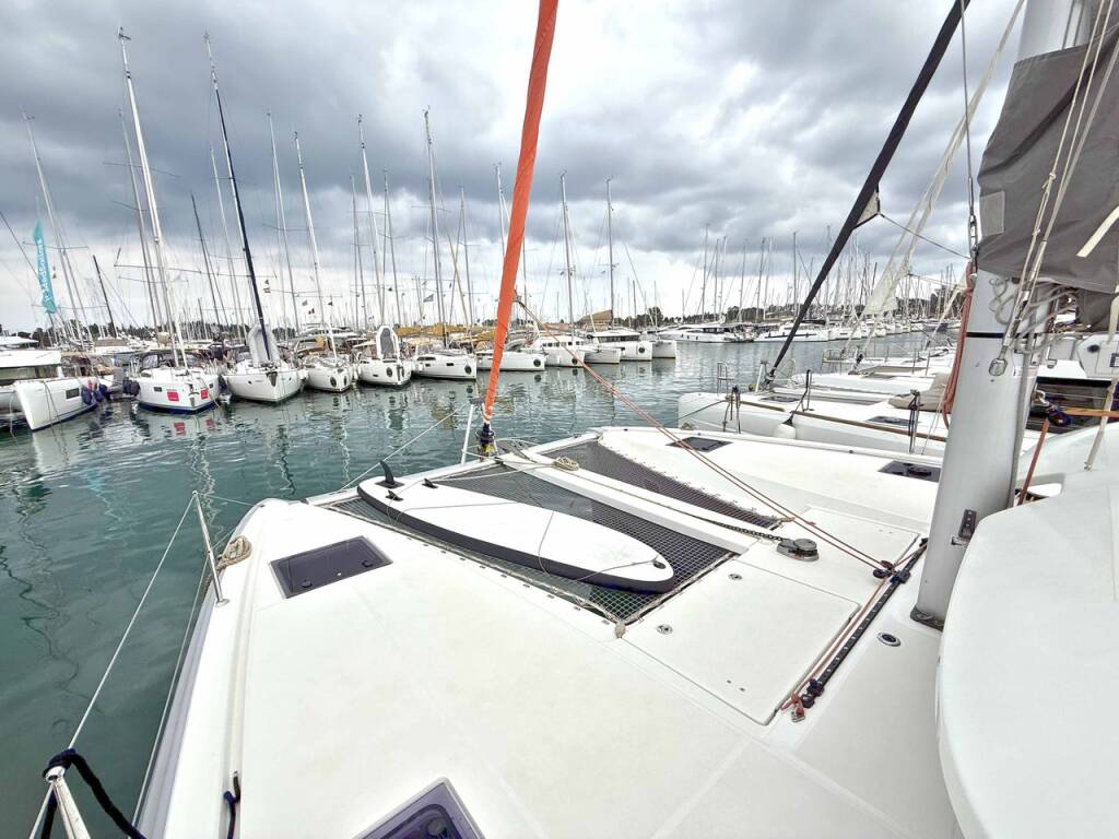 Katamaran Excess 11 Roxy, Baujahr 2021, liegt im Corfu, Gouvia Marina, Ionisches Meer, Griechenland vor Anker. Es verfügt über 4 + 2 Kabinen und bietet Platz für 8 + 2 Personen mit 2 Toiletten.