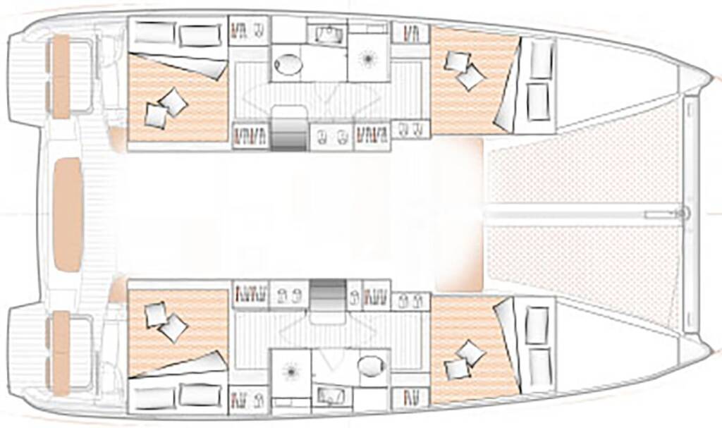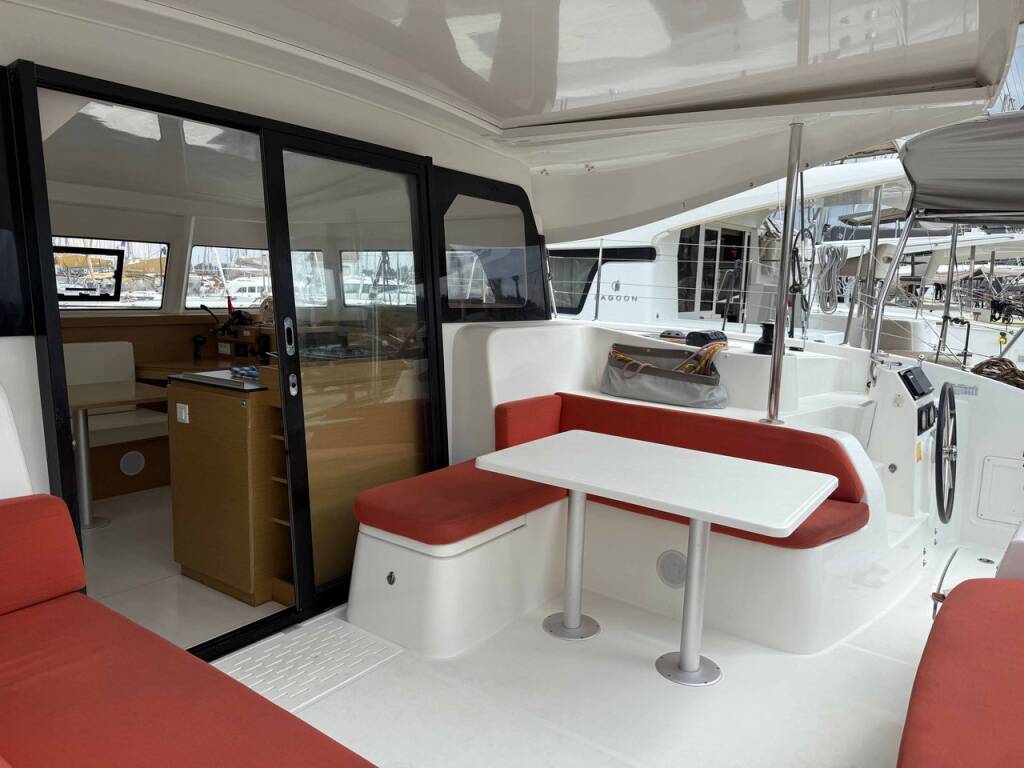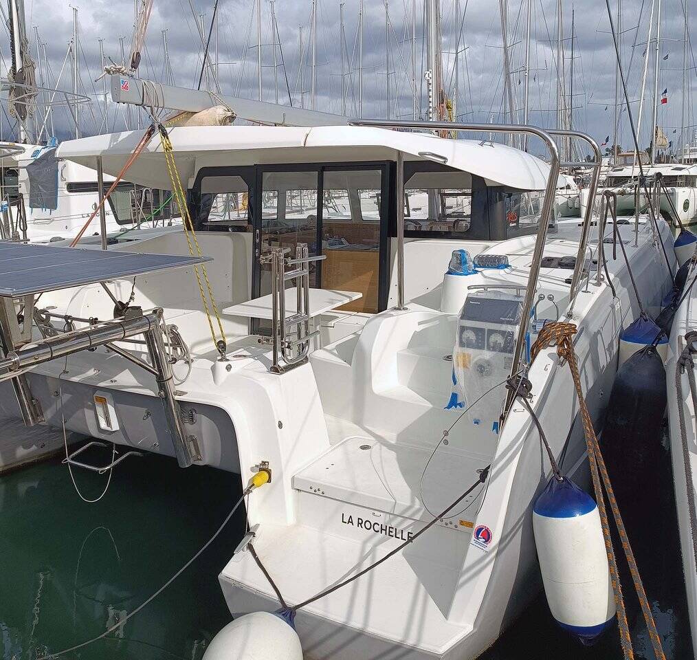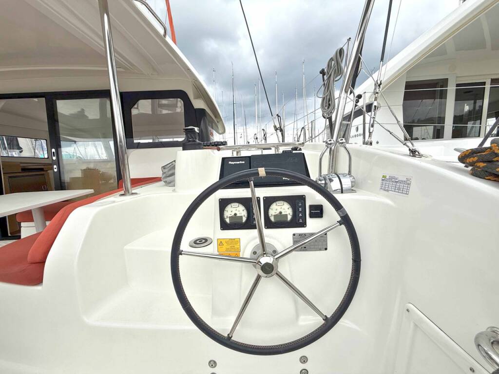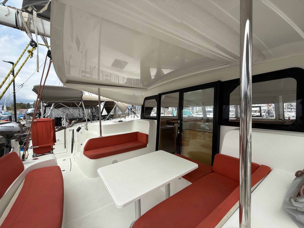 Katamaran Excess 11 Roxy, Baujahr 2021, liegt im Corfu, Gouvia Marina, Ionisches Meer, Griechenland vor Anker. Es verfügt über 4 + 2 Kabinen und bietet Platz für 8 + 2 Personen mit 2 Toiletten.