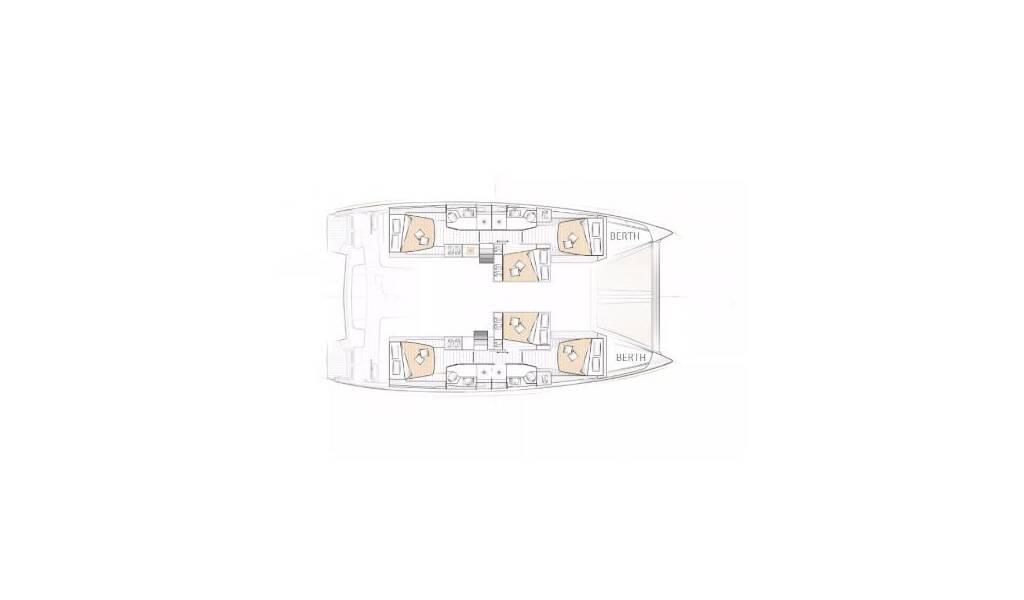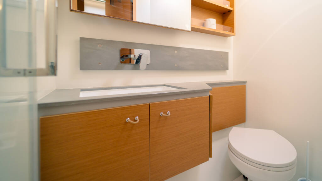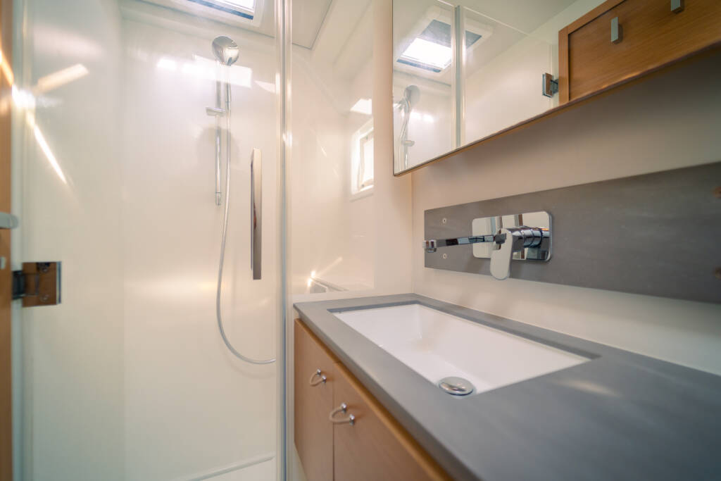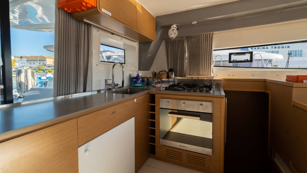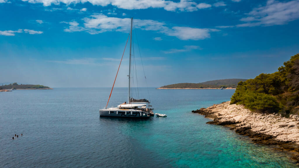 Katamaran Excess 15 Faros, Baujahr 2023, liegt im Trogir, Yachtclub Seget (Marina Baotić), Split & Umgebung, Kroatien vor Anker. Es verfügt über 6 + 2 Kabinen und bietet Platz für 12 + 2 Personen mit 4 Toiletten.