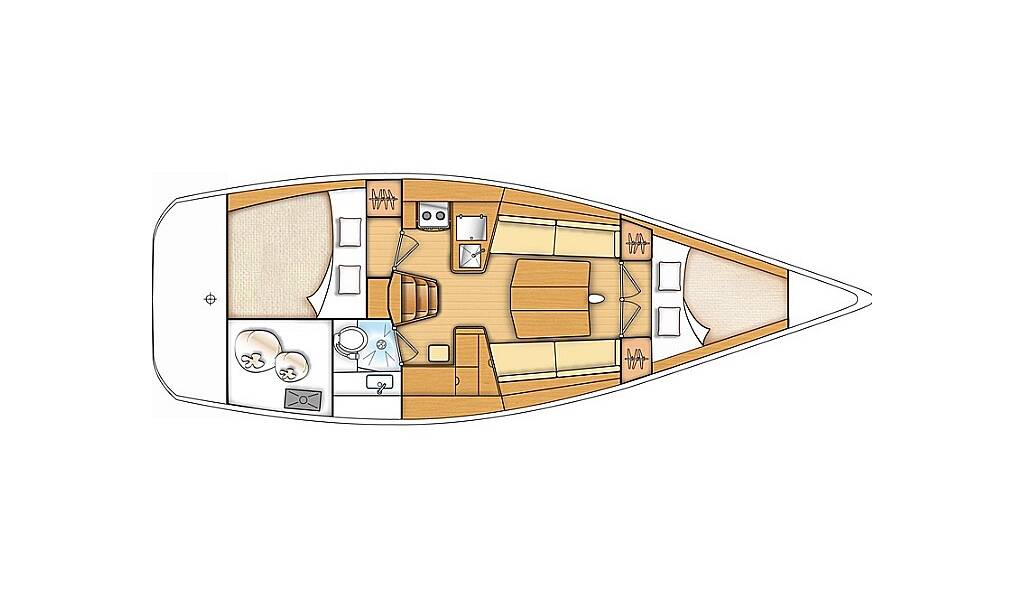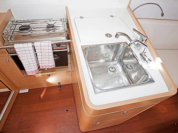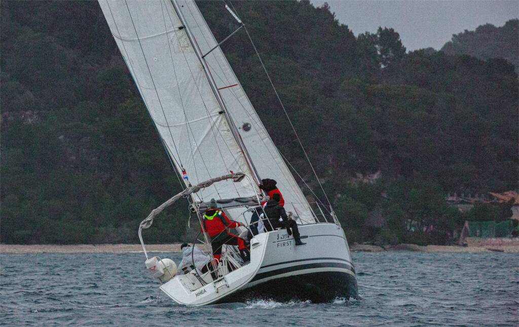Segelyacht First 35 Rhea, Baujahr 2011, liegt im Pula, Marina Polesana, Istrien, Kroatien vor Anker. Es verfügt über 2 Kabinen und bietet Platz für 4 + 2 Personen mit 1 Toiletten.