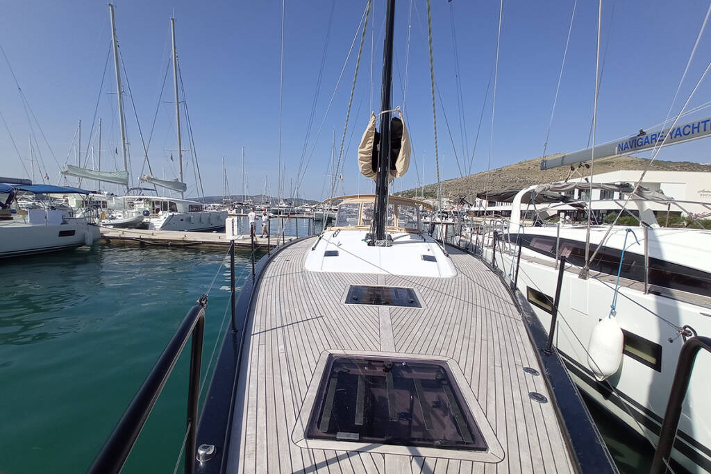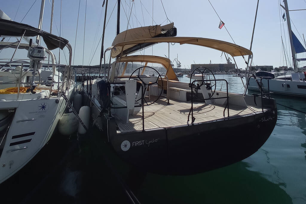 Segelyacht First 53 Silhuette, Baujahr 2022, liegt im Marina Kremik, Primosten, Sibenik & Umgebung, Kroatien vor Anker. Es verfügt über 3 + 1 Kabinen und bietet Platz für 6 + 1 Personen mit 3 + 1 Toiletten.