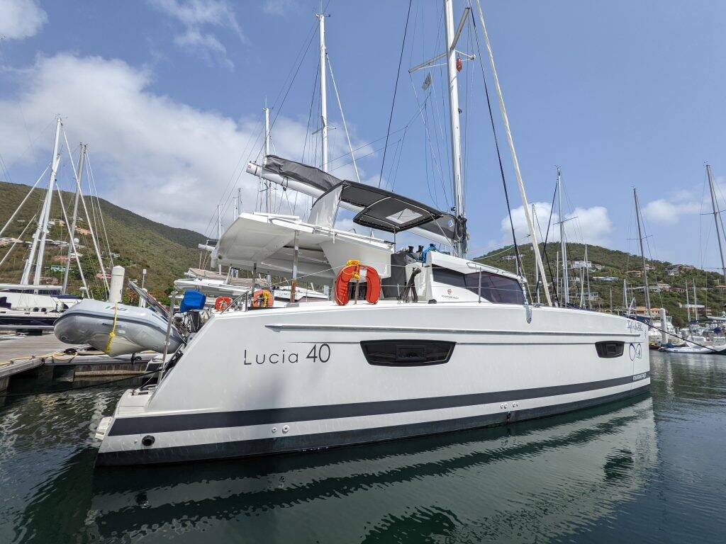 Katamaran Fountaine Pajot Lucia 40 Infinite Blue, Baujahr 2020, liegt im St. Thomas, Frenchtown Marina, US- Virgin Islands, US Virgin Islands vor Anker. Es verfügt über 4 Kabinen und bietet Platz für 8 Personen mit 2 Toiletten.