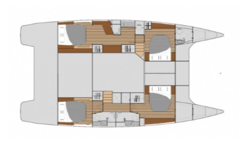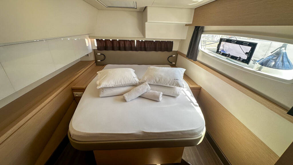 Katamaran Fountaine Pajot Saba 50 Franco Nero, Baujahr 2018, liegt im Marina Kremik, Primosten, Sibenik & Umgebung, Kroatien vor Anker. Es verfügt über 4 + 2 Kabinen und bietet Platz für 8 + 2 + 2 Personen mit 4 + 1 Toiletten.