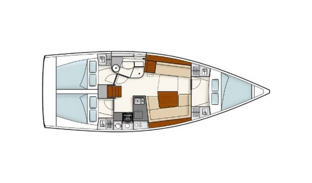 Segelyacht Hanse 385 Ariel, Baujahr 2013, liegt im Marina Mandalina, Sibenik, Sibenik & Umgebung, Kroatien vor Anker. Es verfügt über 3 Kabinen und bietet Platz für 6 Personen mit 1 Toiletten.