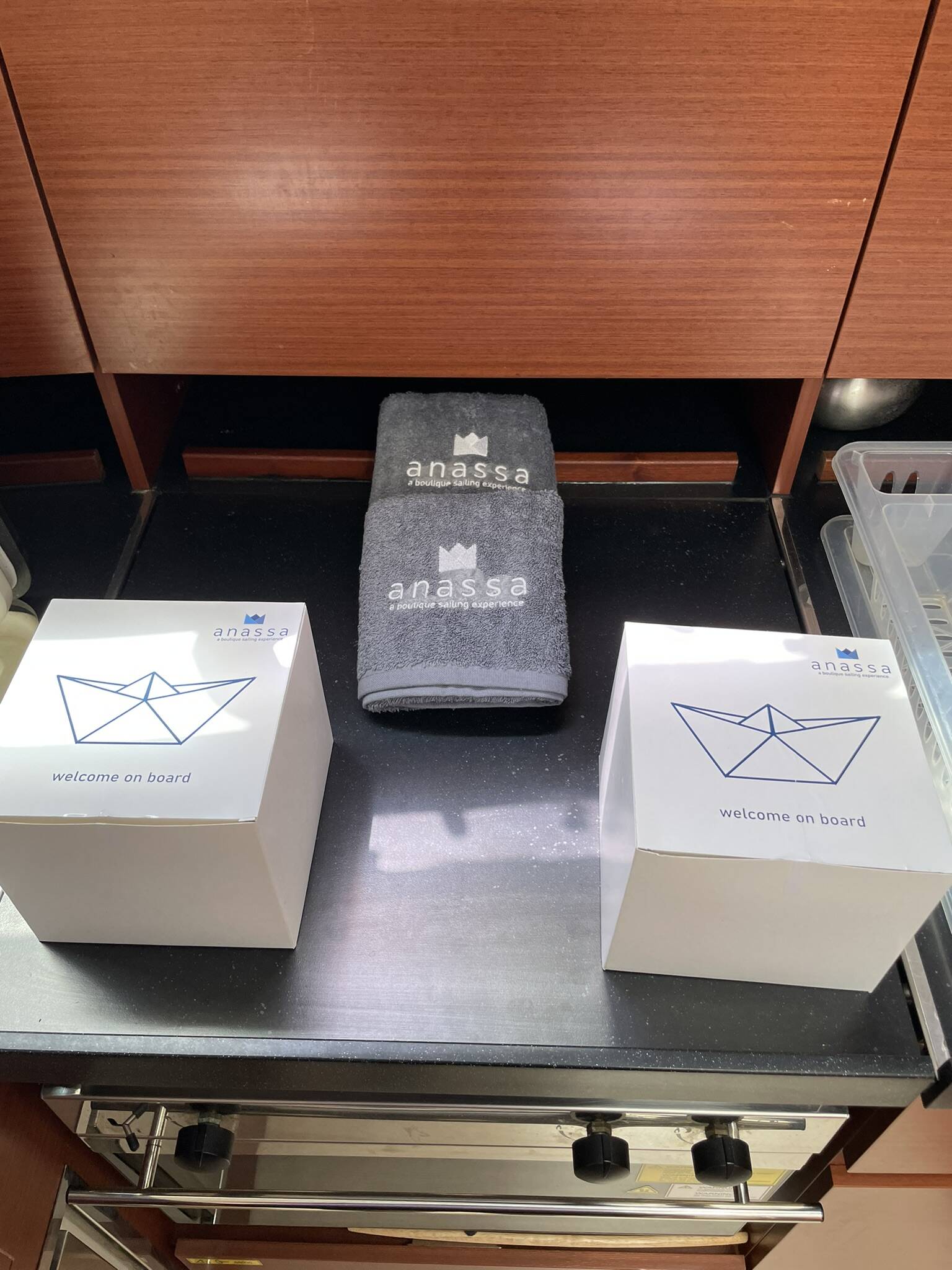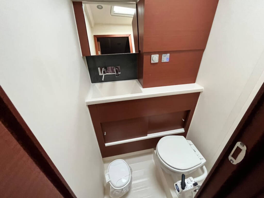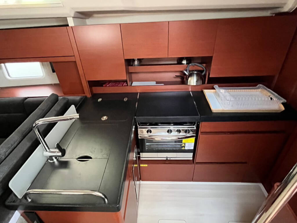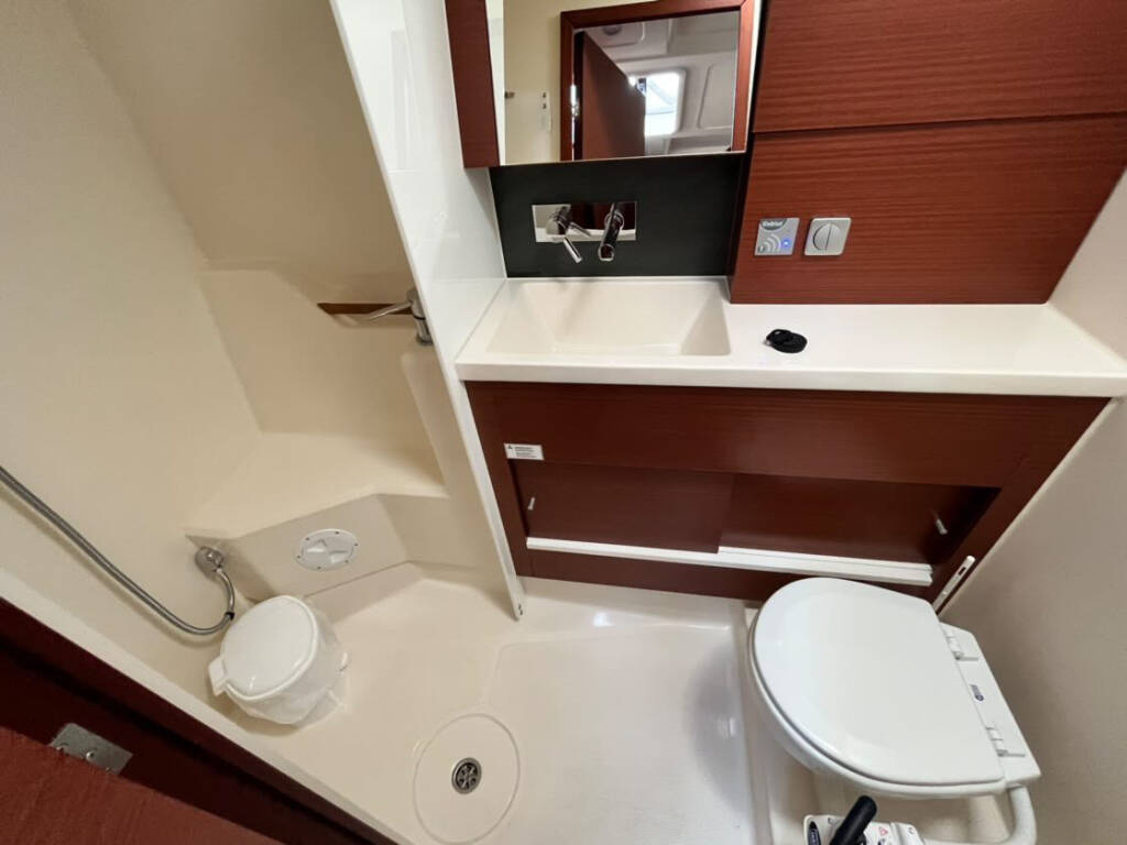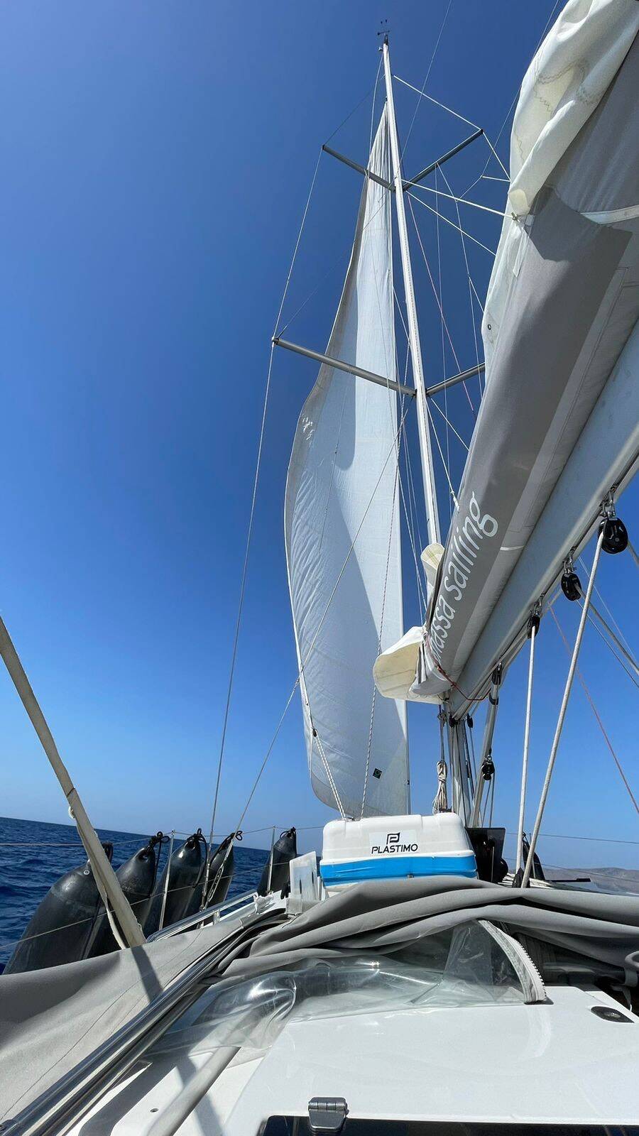 Segelyacht Hanse 458 Avra, Baujahr 2022, liegt im Lefkas, D-Marin, Ionisches Meer, Griechenland vor Anker. Es verfügt über 4 Kabinen und bietet Platz für 8 + 2 Personen mit 2 Toiletten.