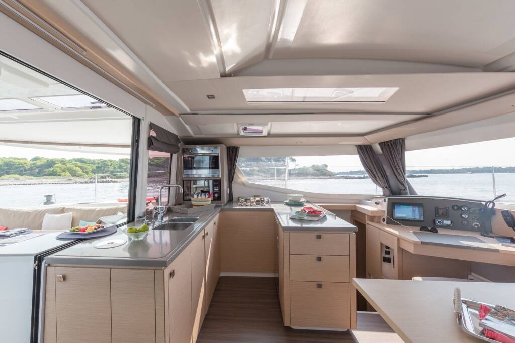 Katamaran Helia 44 Lounge, Baujahr 2018, liegt im Porto Montenegro, Montenegro, Montenegro vor Anker. Es verfügt über 4 Kabinen und bietet Platz für 8 + 2 Personen mit 4 Toiletten.
