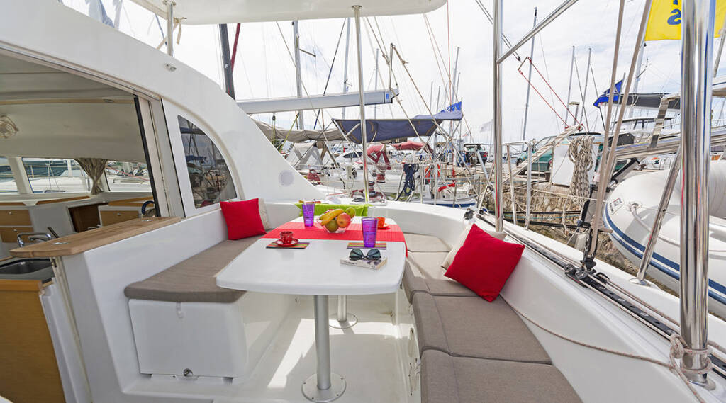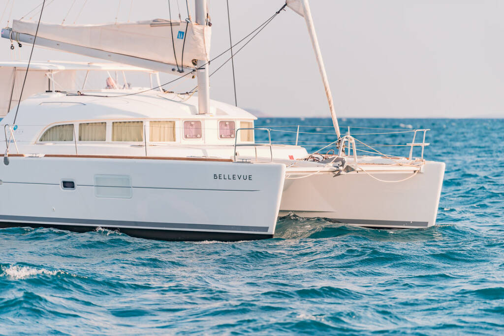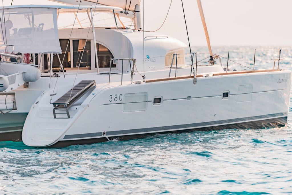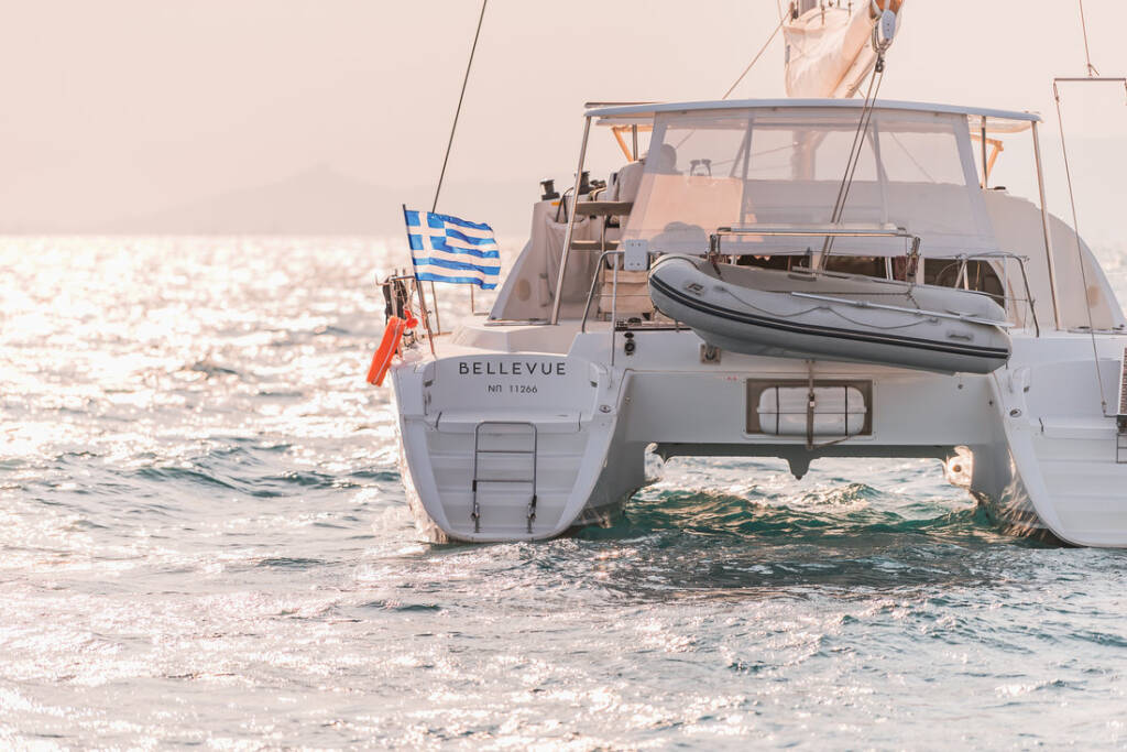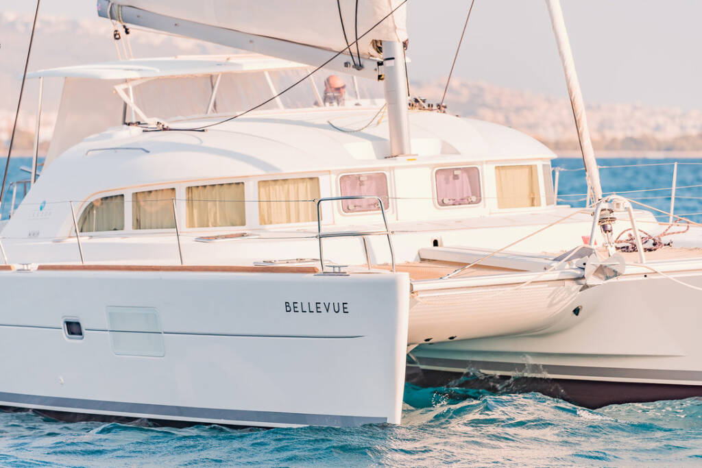 Katamaran Lagoon 380 Bellevue, Baujahr 2015, liegt im Lavrion, main port, Athens area/Saronic/Peloponese, Griechenland vor Anker. Es verfügt über 4 + 2 Kabinen und bietet Platz für 8 + 2 Personen mit 2 Toiletten.