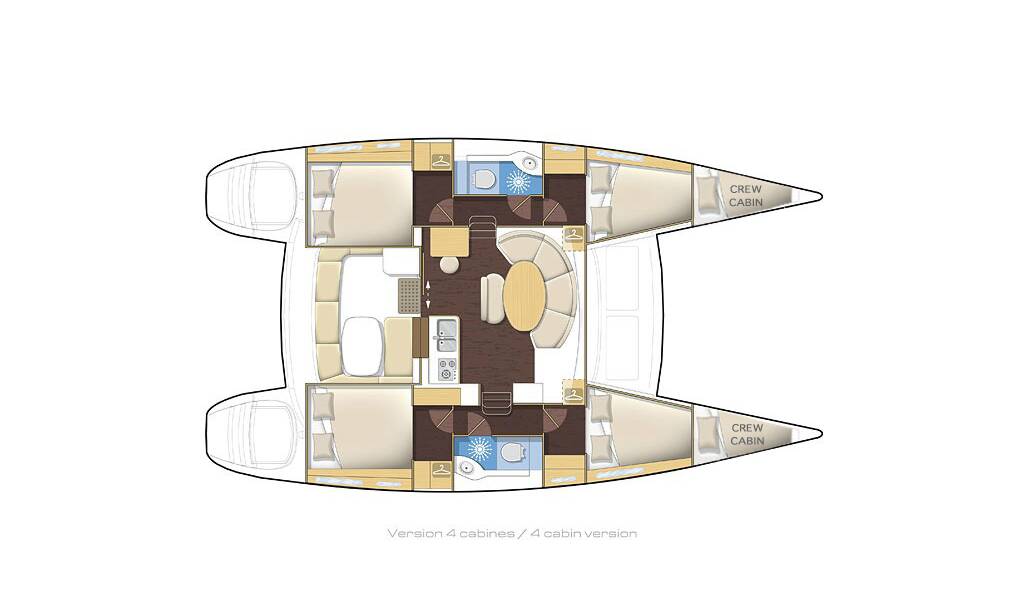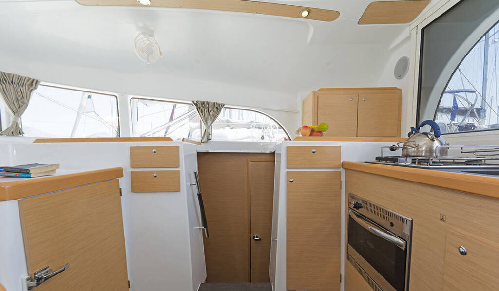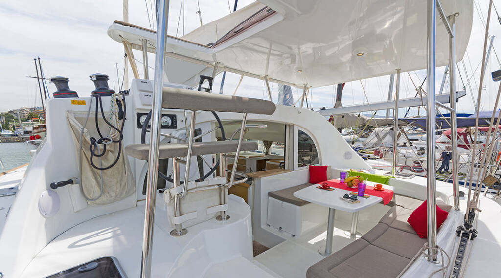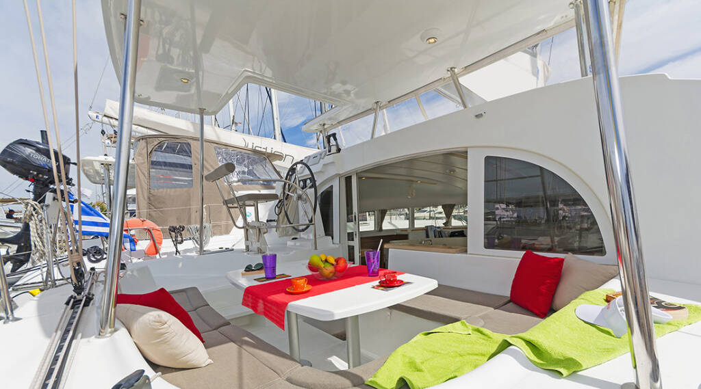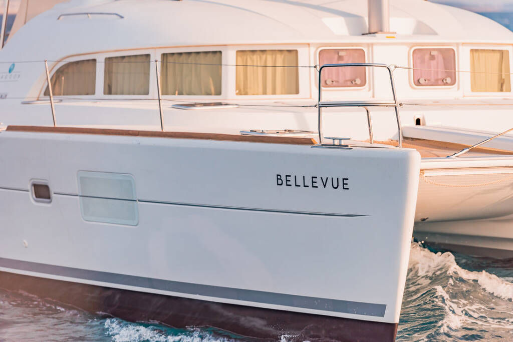 Katamaran Lagoon 380 Bellevue, Baujahr 2015, liegt im Lavrion, main port, Athens area/Saronic/Peloponese, Griechenland vor Anker. Es verfügt über 4 + 2 Kabinen und bietet Platz für 8 + 2 Personen mit 2 Toiletten.