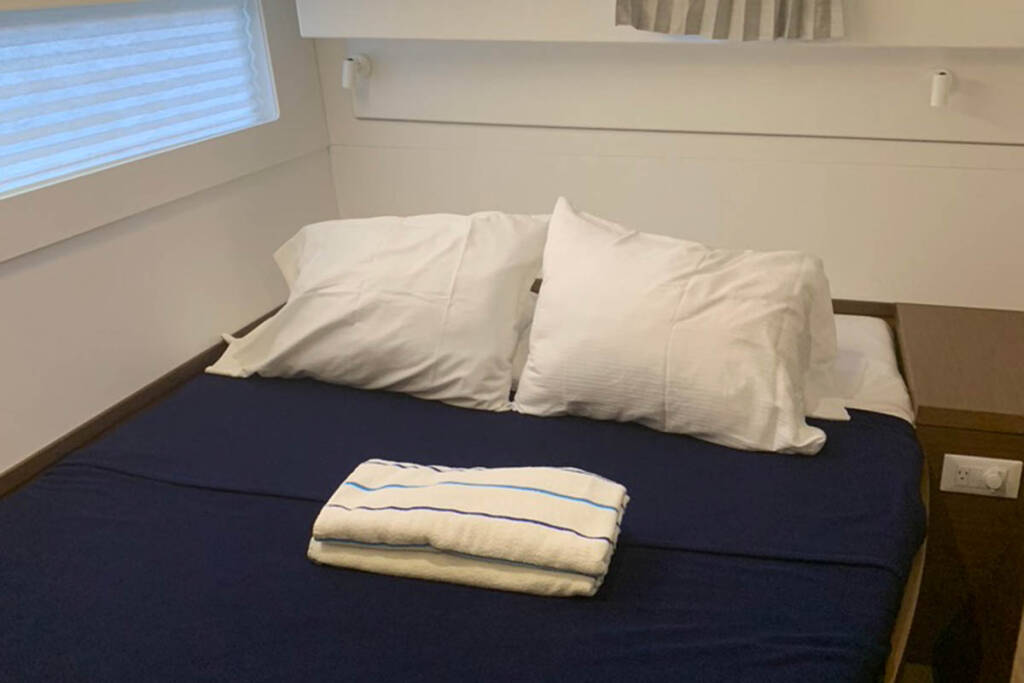 Katamaran Lagoon 40 Mala, Baujahr 2020, liegt im Trogir, Yachtclub Seget (Marina Baotić), Split & Umgebung, Kroatien vor Anker. Es verfügt über 3 + 2 Kabinen und bietet Platz für 6 + 2 + 2 Personen mit 2 Toiletten.