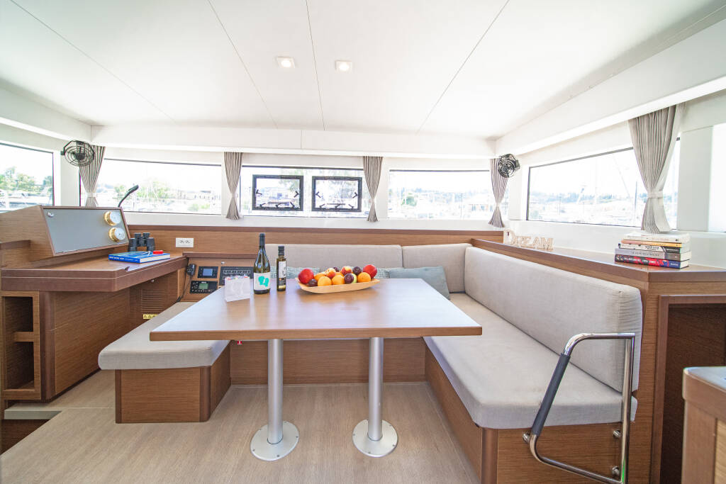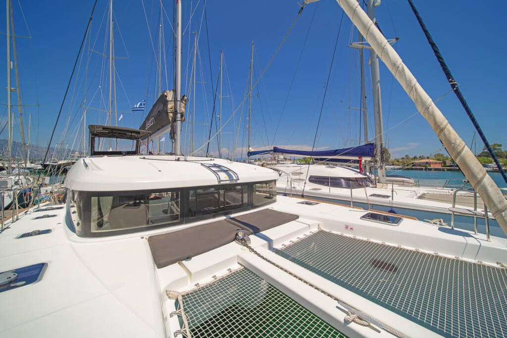 Katamaran Lagoon 40 Thalasea, Baujahr 2020, liegt im Corfu, Gouvia Marina, Ionisches Meer, Griechenland vor Anker. Es verfügt über 4 + 2 Kabinen und bietet Platz für 8 + 2 Personen mit 4 + 1 Toiletten.