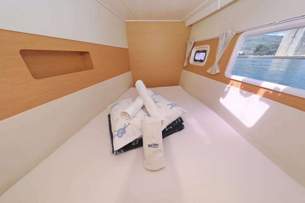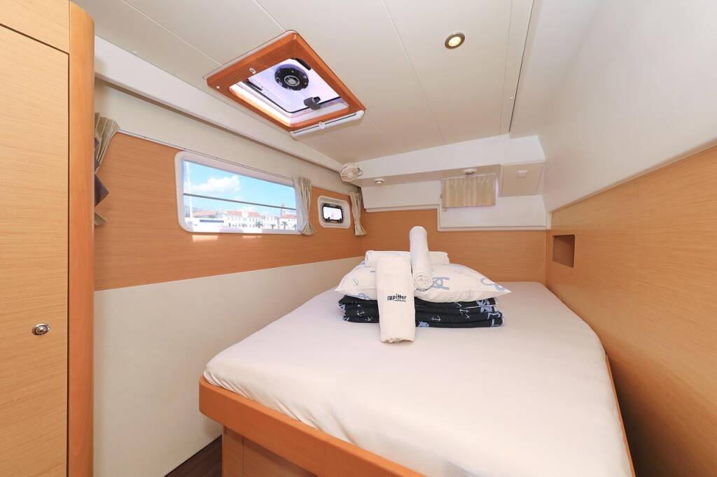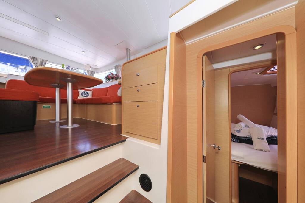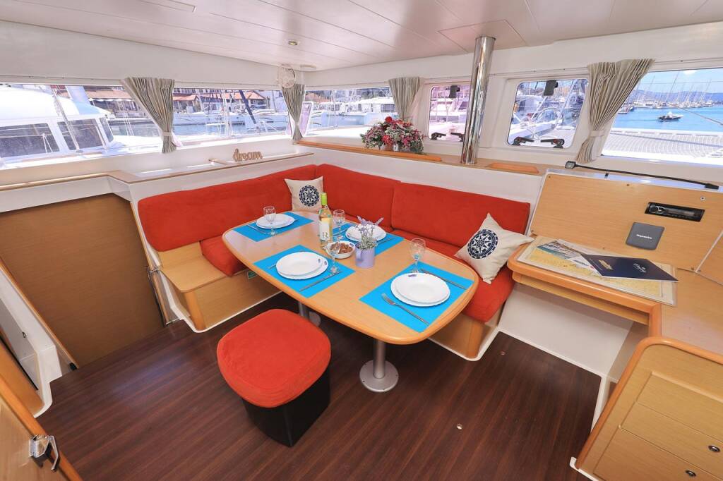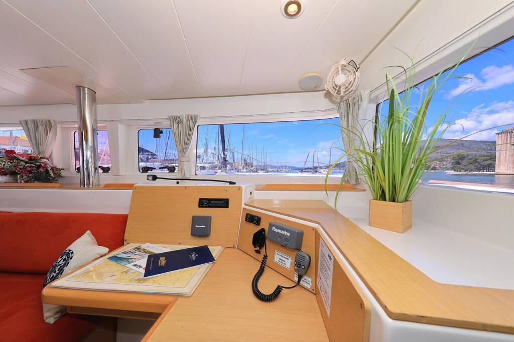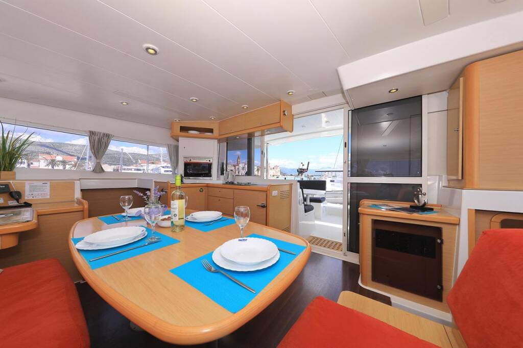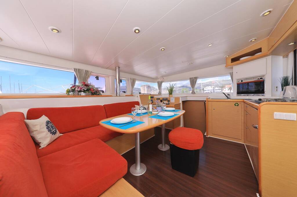 Katamaran Lagoon 400 Pagomo nayan, Baujahr 2012, liegt im ACI Marina Trogir, Split & Umgebung, Kroatien vor Anker. Es verfügt über 4 + 2 Kabinen und bietet Platz für 8 + 2 + 2 Personen mit 4 Toiletten.