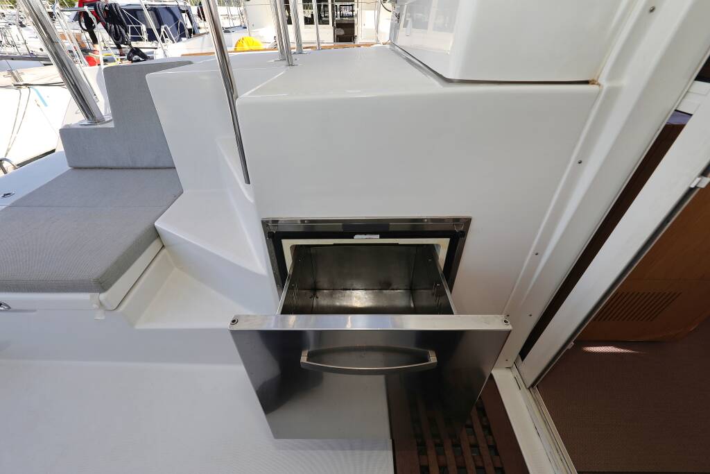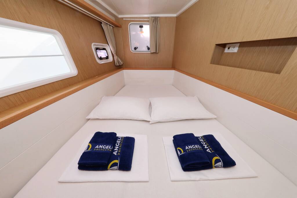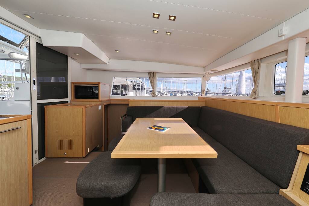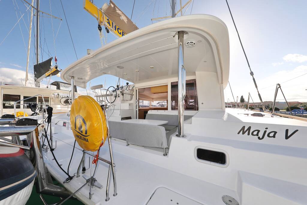 Katamaran Lagoon 400 S2 Maja V, Baujahr 2013, liegt im Biograd, Marina Molum (Sv. Filip i Jakov), Zadar & Umgebung, Kroatien vor Anker. Es verfügt über 4 + 2 Kabinen und bietet Platz für 8 + 2 + 2 Personen mit 4 Toiletten.