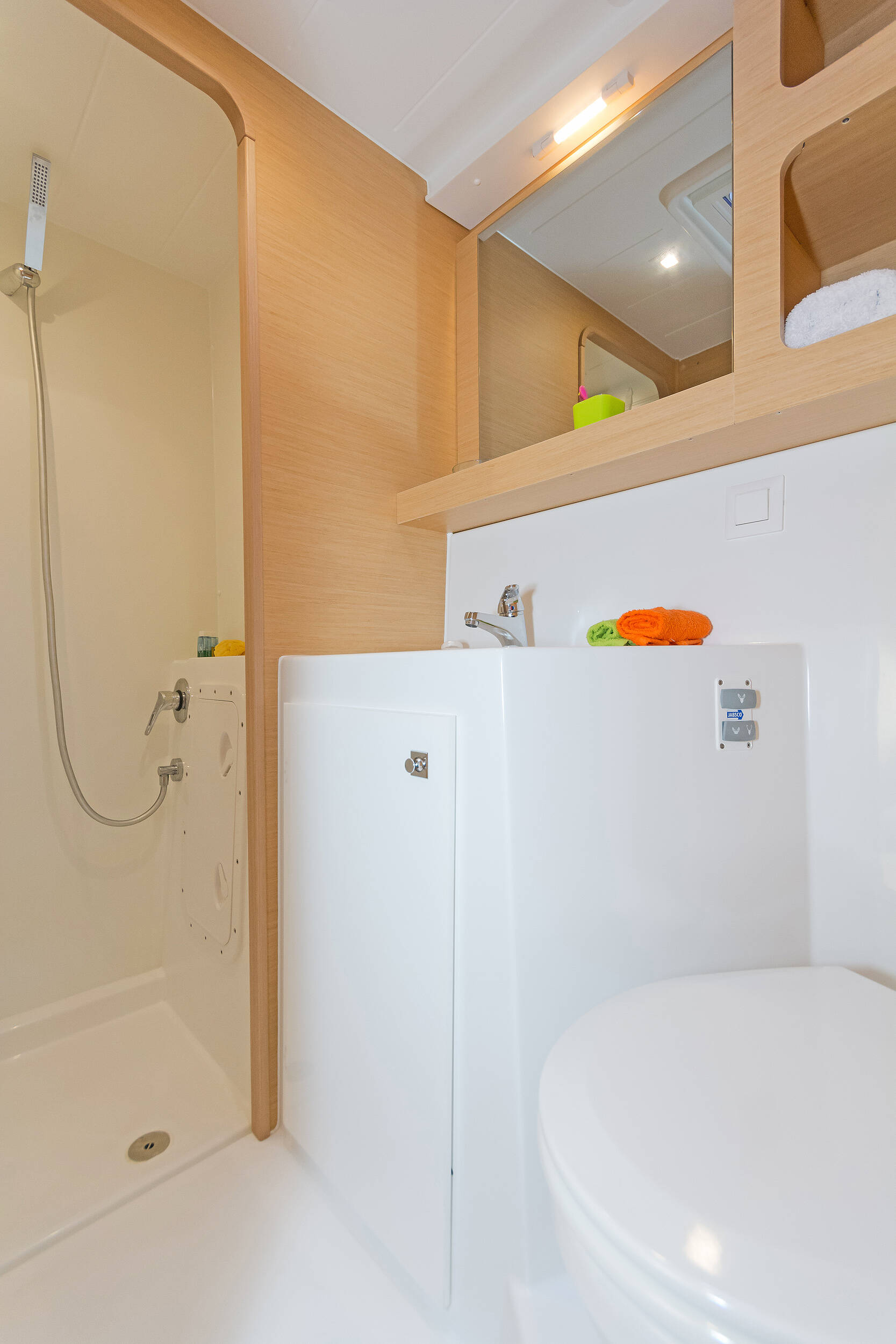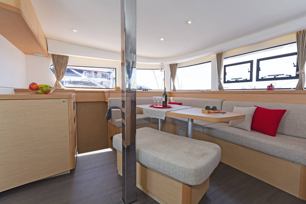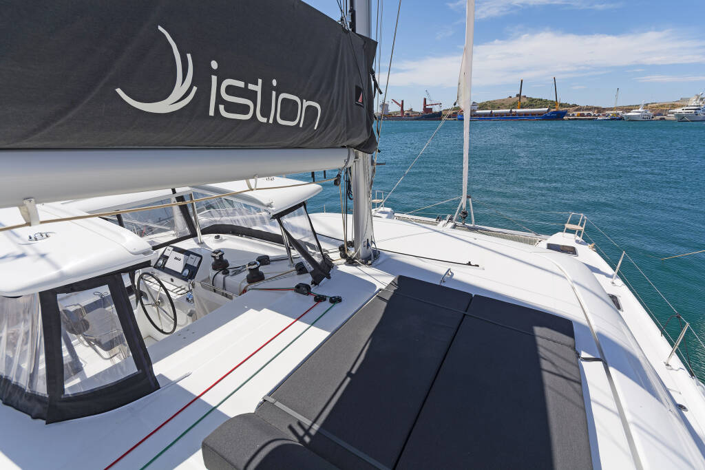 Katamaran Lagoon 42 Amici, Baujahr 2020, liegt im Athens, Alimos marina, Athens area/Saronic/Peloponese, Griechenland vor Anker. Es verfügt über 4 + 2 Kabinen und bietet Platz für 8 + 2 Personen mit 4 + 1 Toiletten.