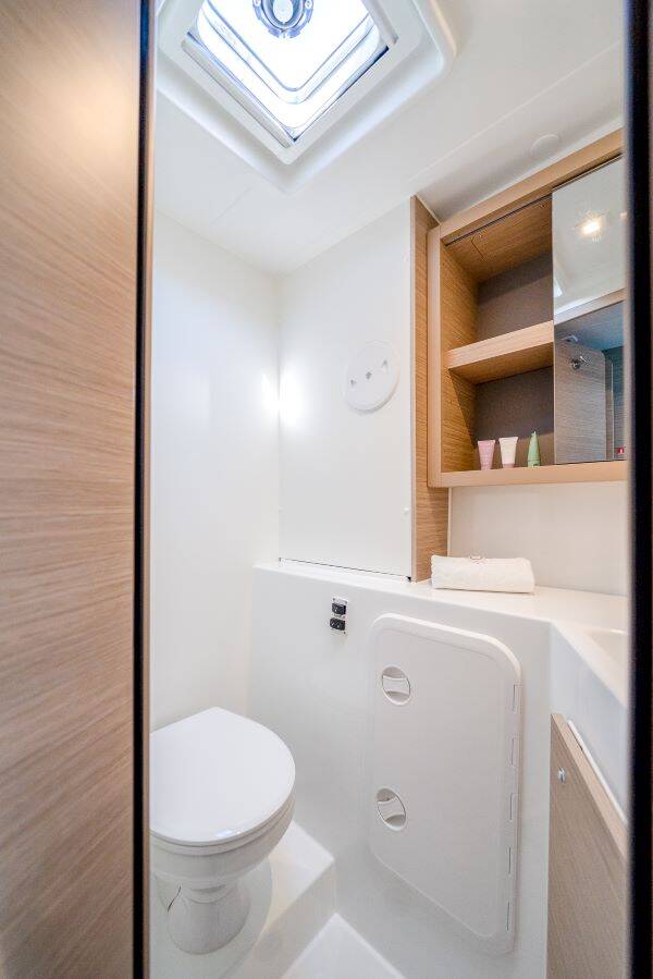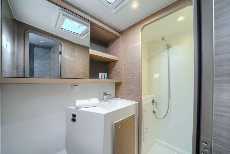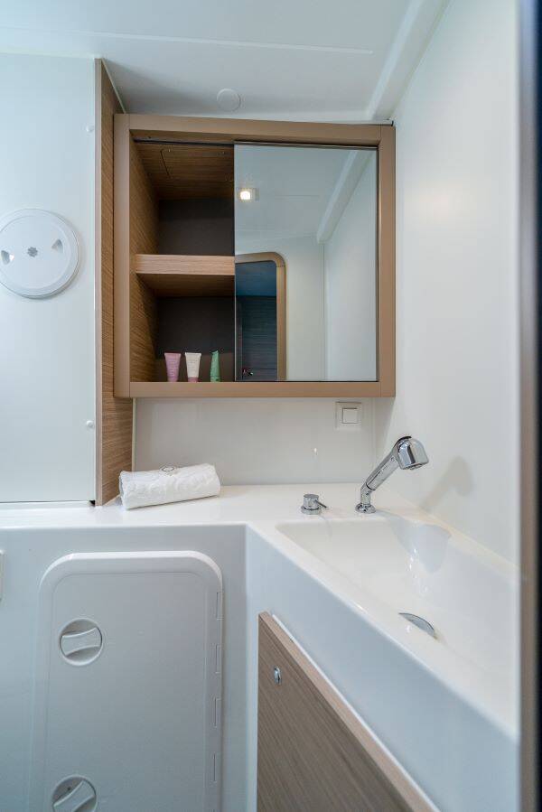 Katamaran Lagoon 42 Brattia, Baujahr 2025, liegt im Marina Kastela, Split & Umgebung, Kroatien vor Anker. Es verfügt über 4 + 2 Kabinen und bietet Platz für 8 + 2 + 2 Personen mit 4 Toiletten.