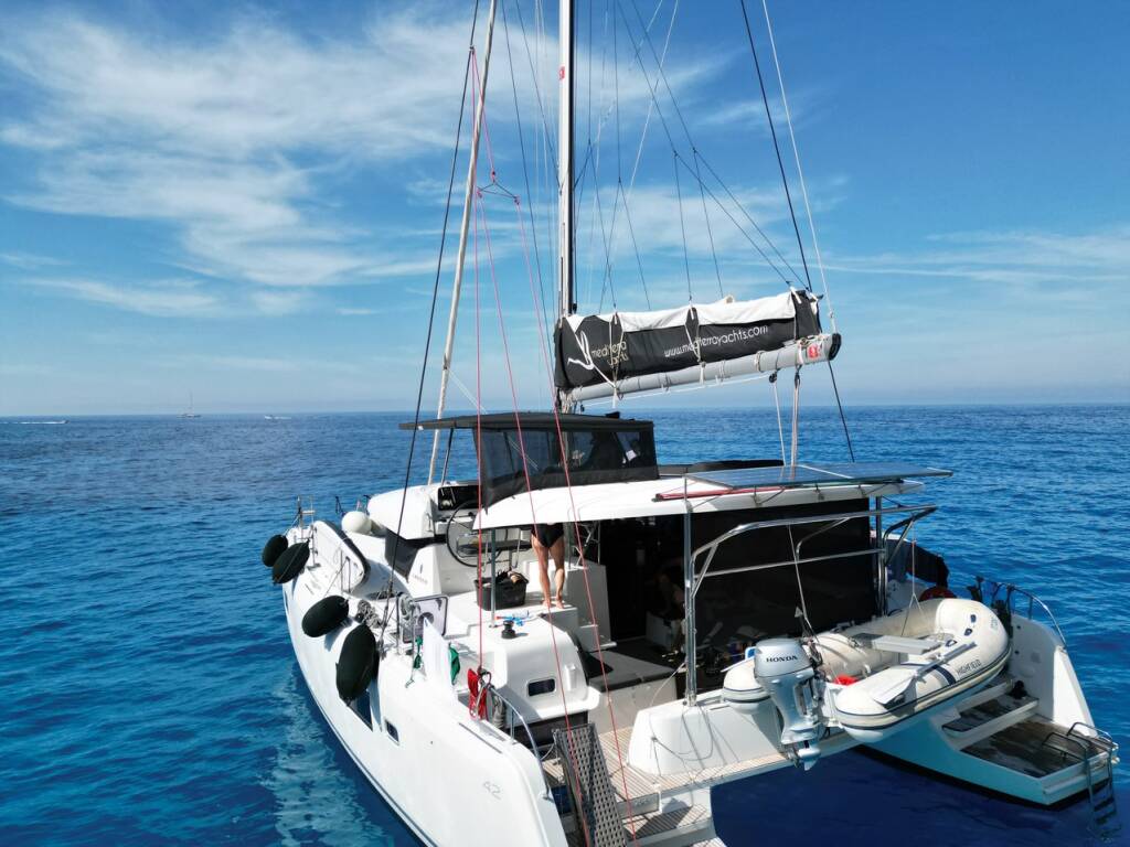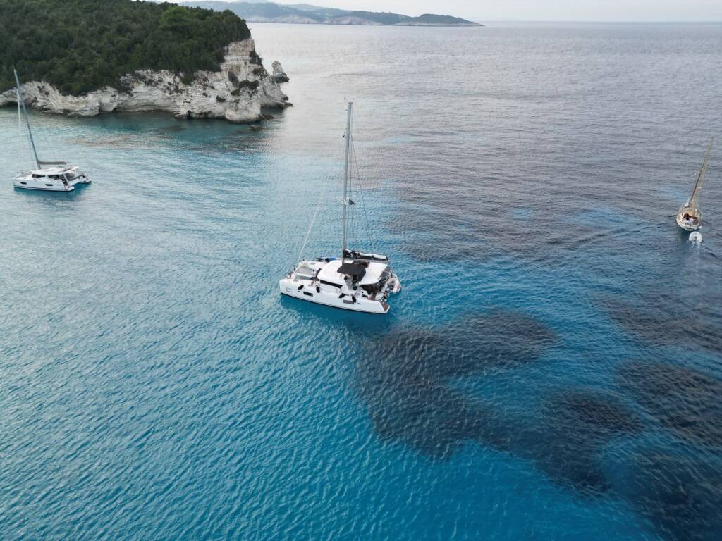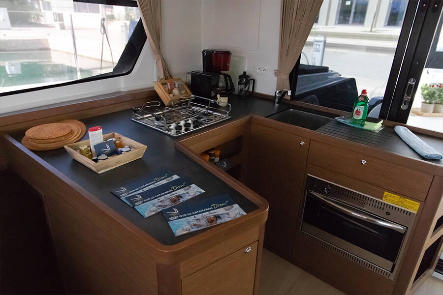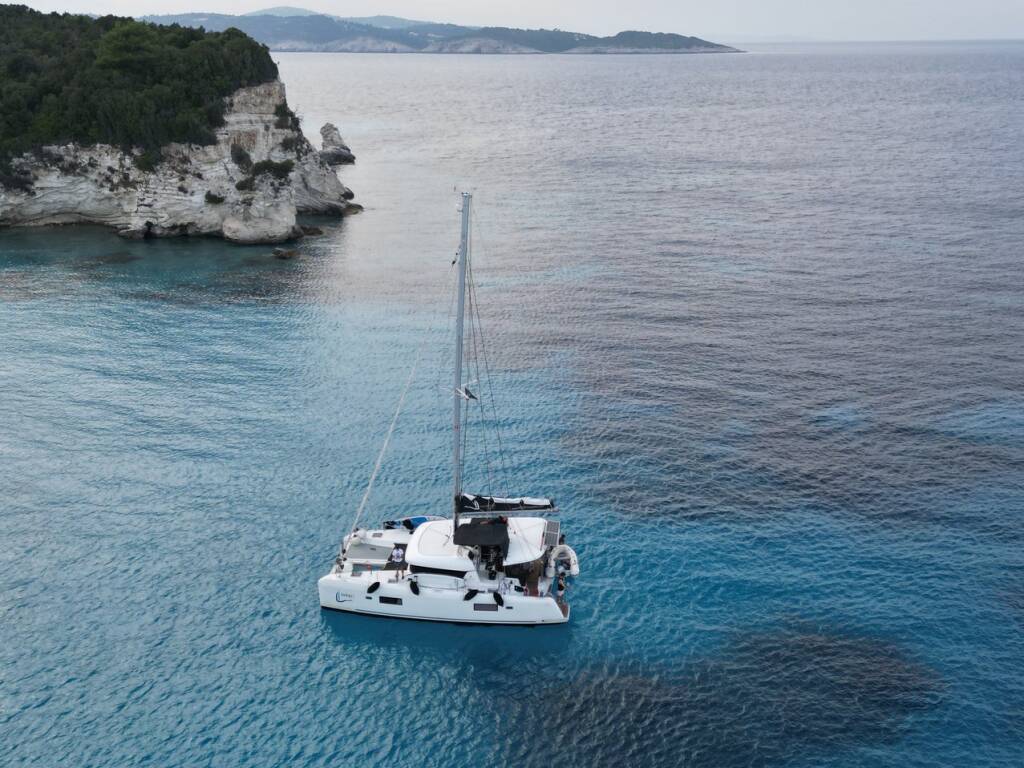 Katamaran Lagoon 42 Dioni, Baujahr 2019, liegt im Preveza Main Port, Ionisches Meer, Griechenland vor Anker. Es verfügt über 4 + 2 Kabinen und bietet Platz für 8 + 2 Personen mit 5 Toiletten.