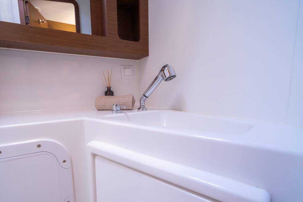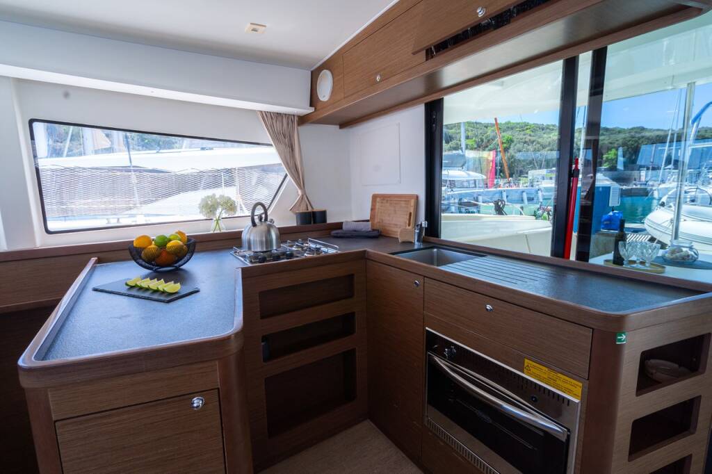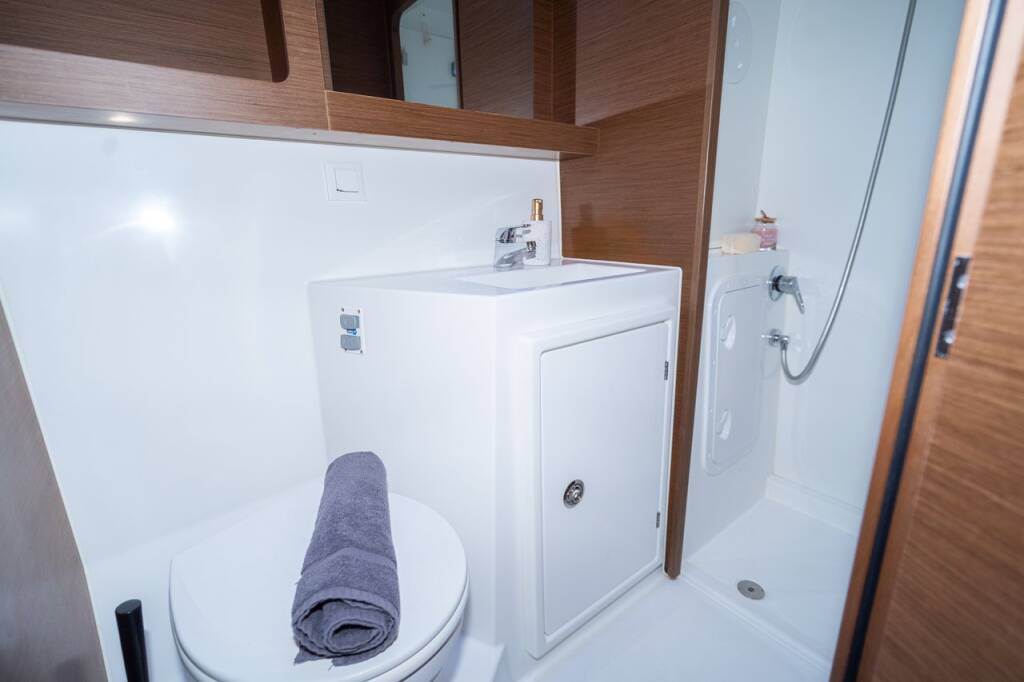 Katamaran Lagoon 42 Fleur de Sel, Baujahr 2018, liegt im Marina Tehnomont Veruda, Pula, Istrien, Kroatien vor Anker. Es verfügt über 4 + 2 Kabinen und bietet Platz für 8 + 2 Personen mit 4 Toiletten.
