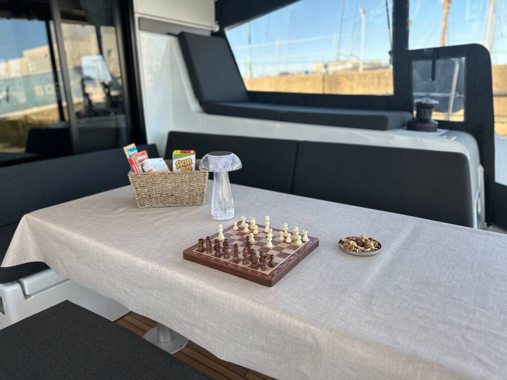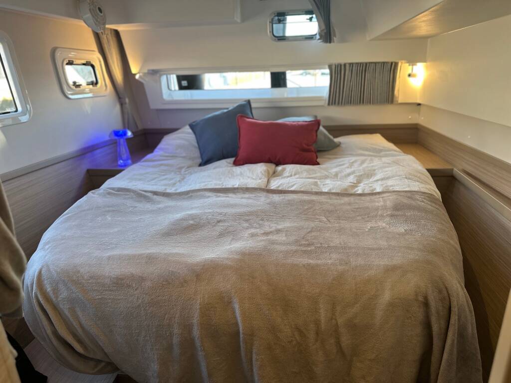 Katamaran Lagoon 42 Lady Aurora, Baujahr 2025, liegt im Marina Frapa, Rogoznica, Sibenik & Umgebung, Kroatien vor Anker. Es verfügt über 4 + 2 Kabinen und bietet Platz für 8 + 2 + 2 Personen mit 4 Toiletten.