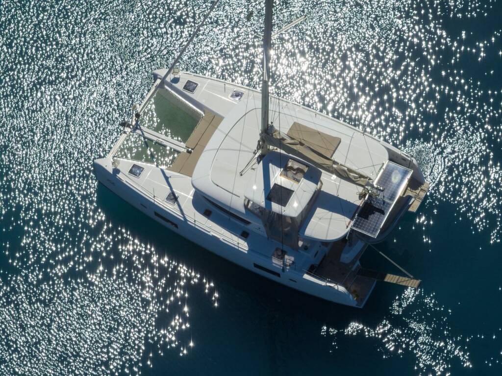 Katamaran Lagoon 42 Lola, Baujahr 2022, liegt im Lefkas main port, Ionisches Meer, Griechenland vor Anker. Es verfügt über 4 + 2 Kabinen und bietet Platz für 8 + 2 Personen mit 4 Toiletten.