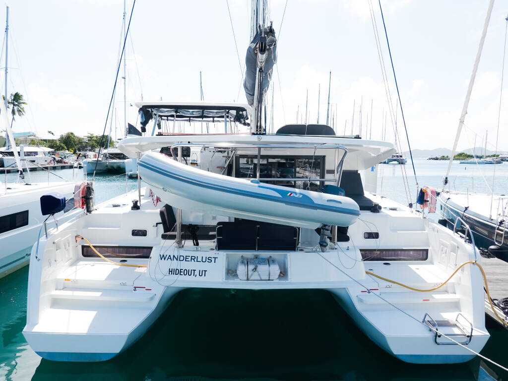 Katamaran Lagoon 42 OW Wanderlust, Baujahr 2023, liegt im BVI, Tortola, Nanny Cay Marina, Britische Jungferninseln (BVI), Britische Jungferninseln (BVI) vor Anker. Es verfügt über 3 + 1 Kabinen und bietet Platz für 6 + 1 Personen mit 3 Toiletten.